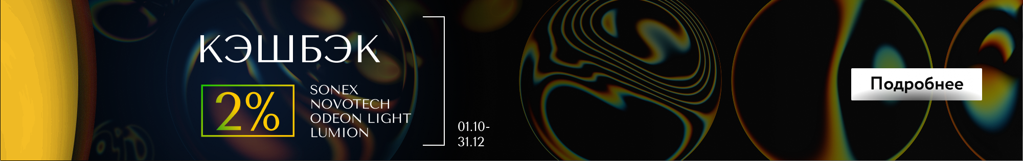 Описание: Акция с кэшбэком 2% при достижении порога закупок на всю номенклатуру интерьерного освещения брендов Sonex, Novotech, Odeon Light, Lumion.