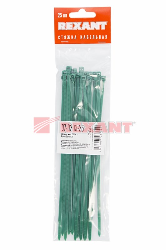 Название производителя: Стяжка кабельная нейлоновая 200x3,6мм, зеленая (25 шт/уп) REXANT
