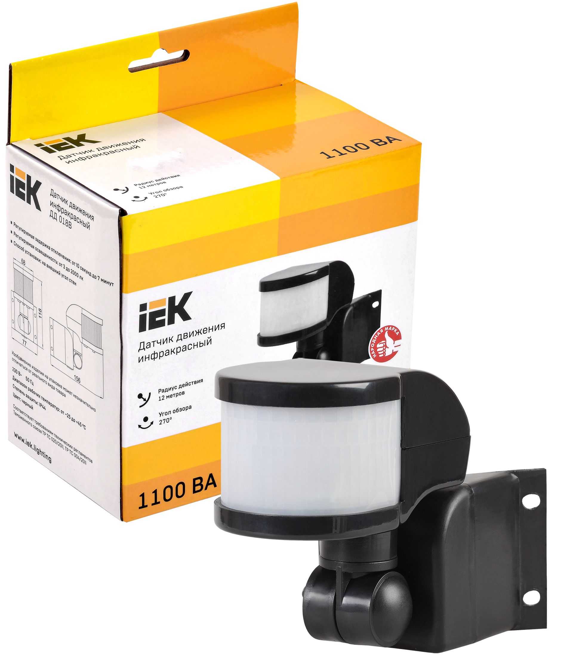 IEK Датчик движения ДД 018В черный, макс. нагрузка 1100Вт, уг 270град, дальность 12м, IP44,