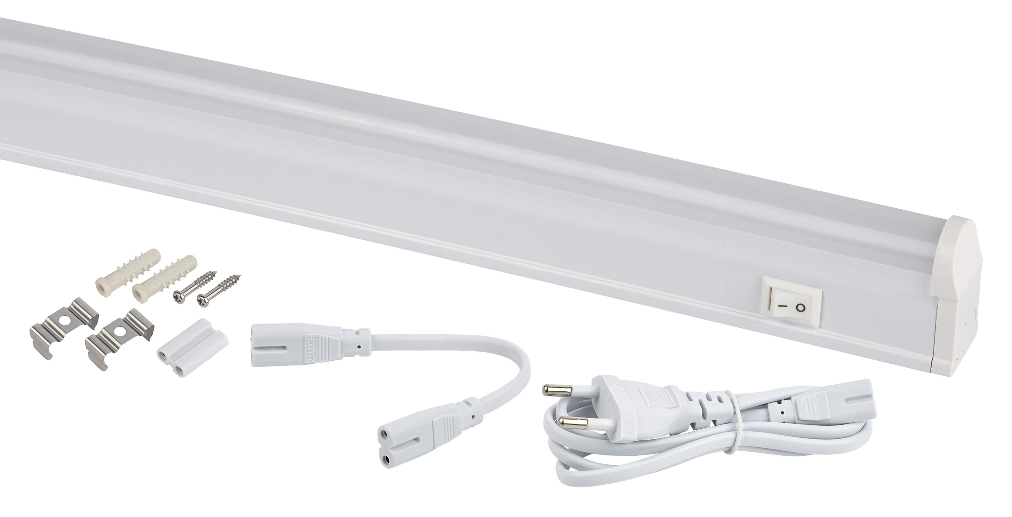 Линейный светодиодный светильник с выключателем. В комплект входит сетевой шнур с вилкой, крепеж для монтажа на вертикальную или горизонтальную поверхность, соединительные элементы для последовательного подключения светильников. Шнур питания подключать со стороны выключателя для корректной работы выключателя. При последовательном соединении нескольких светильников выключатель первого светильника включает и отключает все последующие светильники. Максимально допустимая мощность подключения в линию: 100 Вт. Длина шнура питания 1м. Длина гибкого коннектора 15см.