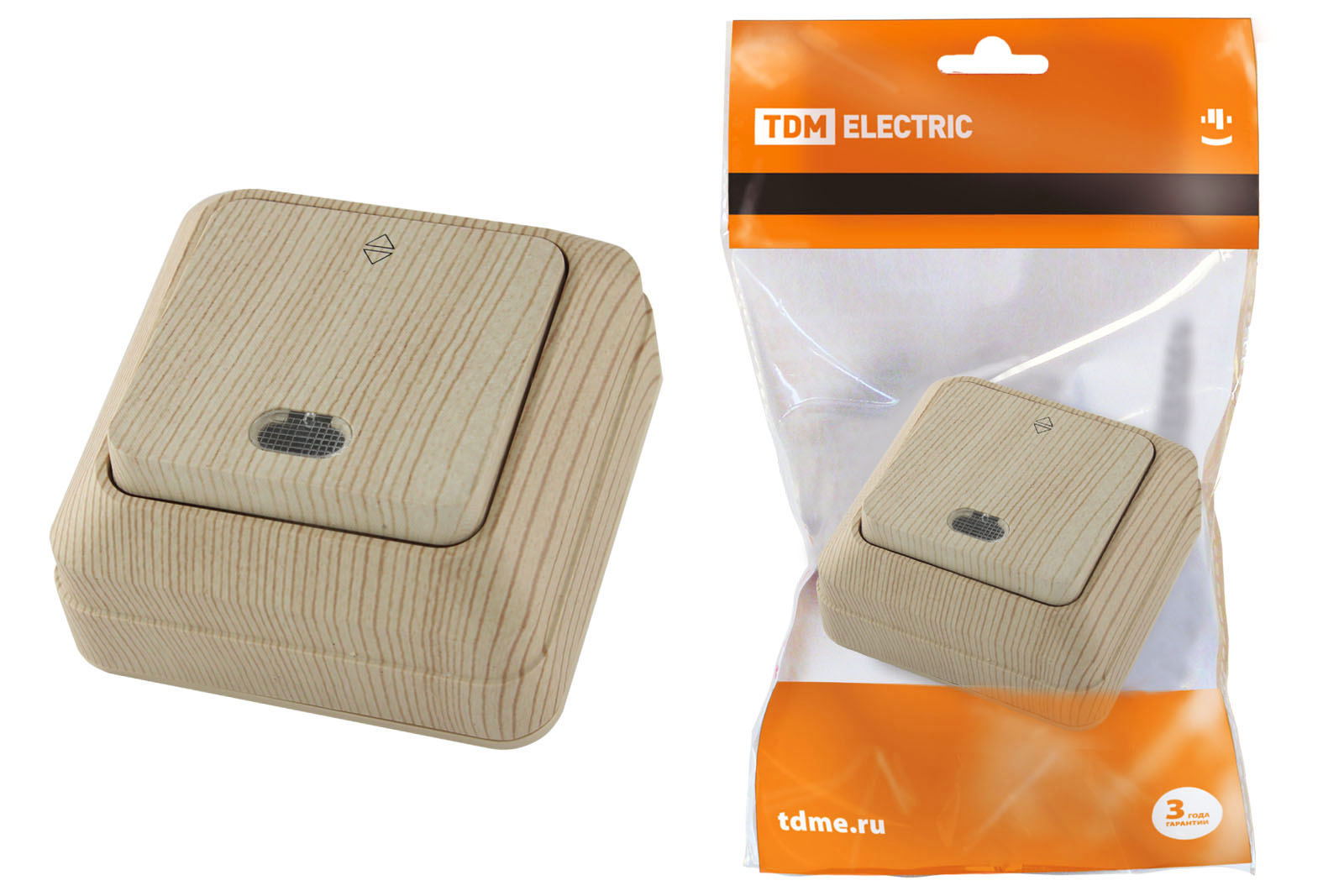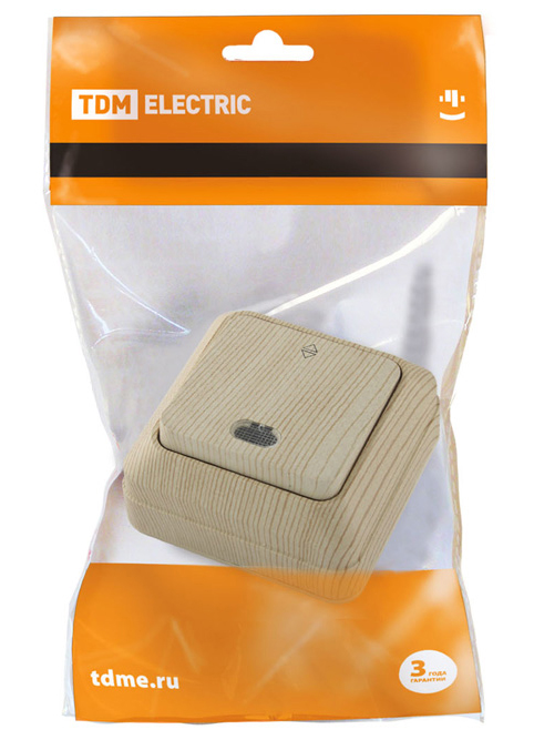 TDM Ладога Переключатель на 2 направления 1-кл. открытой установки с подсветкой IP20 10А, сосна