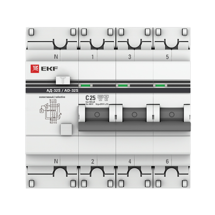 Название производителя: Автоматический выключатель дифференциального тока АД-32 3P+N (S) 25А характеристика C 100мА тип AC электронный селективный 4,5кА PROXIMA EKF
