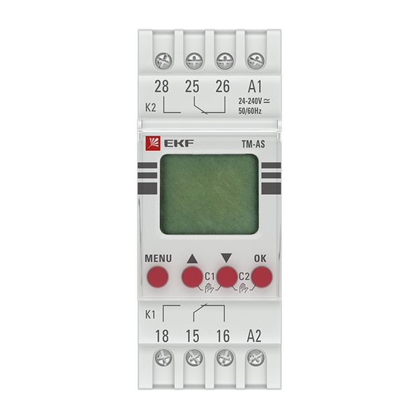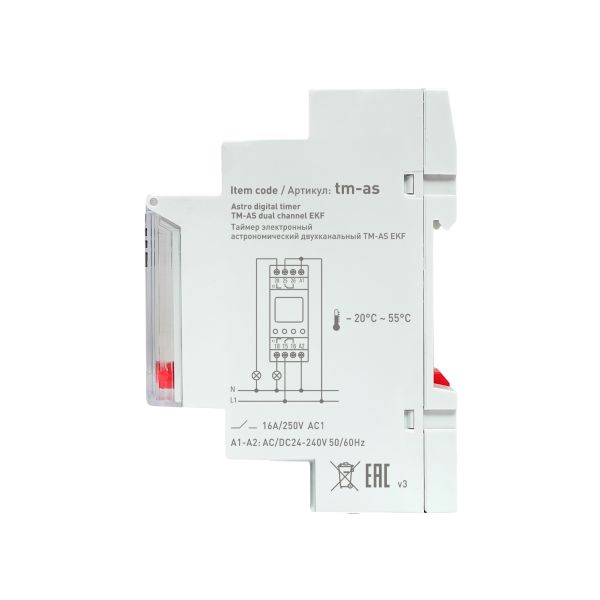 Таймер астрономический TM-AS EKF PROxima представляют собой реле с двумя независимыми группами контактов, момент срабатывания которого (включение/отключение) происходит по времени заката и восхода солнца на основании координат местоположения. Таймер имеет возможность срабатывания (80 программ) по заданному времени и дню недели. Таймер имеет в составе часы, что позволяет отслеживать текущее время.