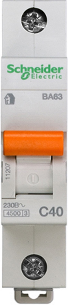 Автоматический выключатель ВА63 серии Домовой Schneider Electric, 1-полюсный на номинальный ток 40А, характеристика С, с отключающей способностью 4500А, ширина 18 мм.