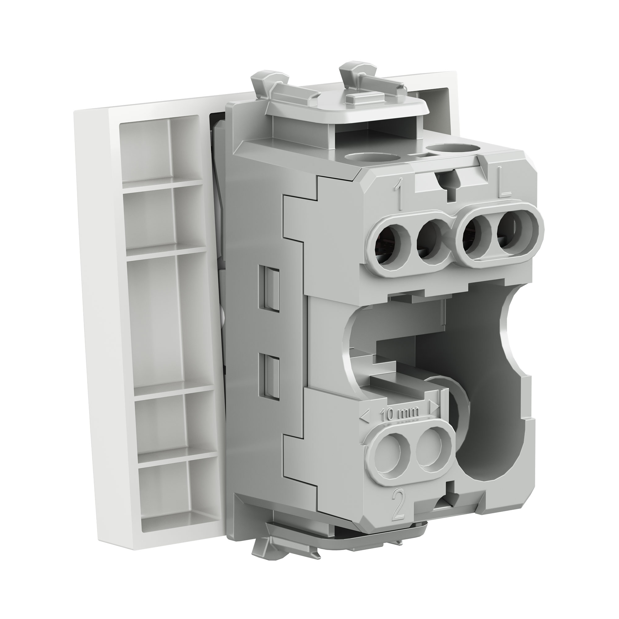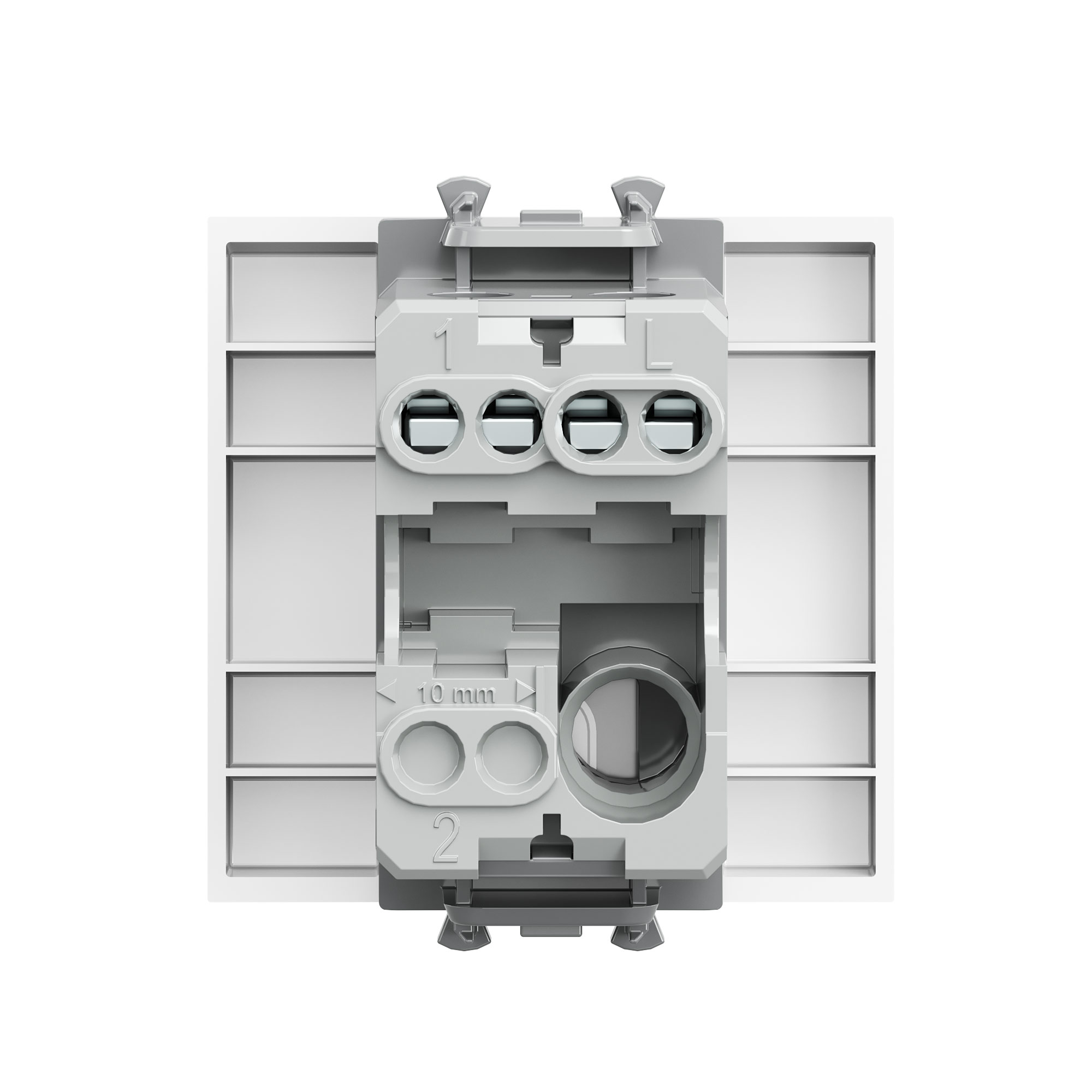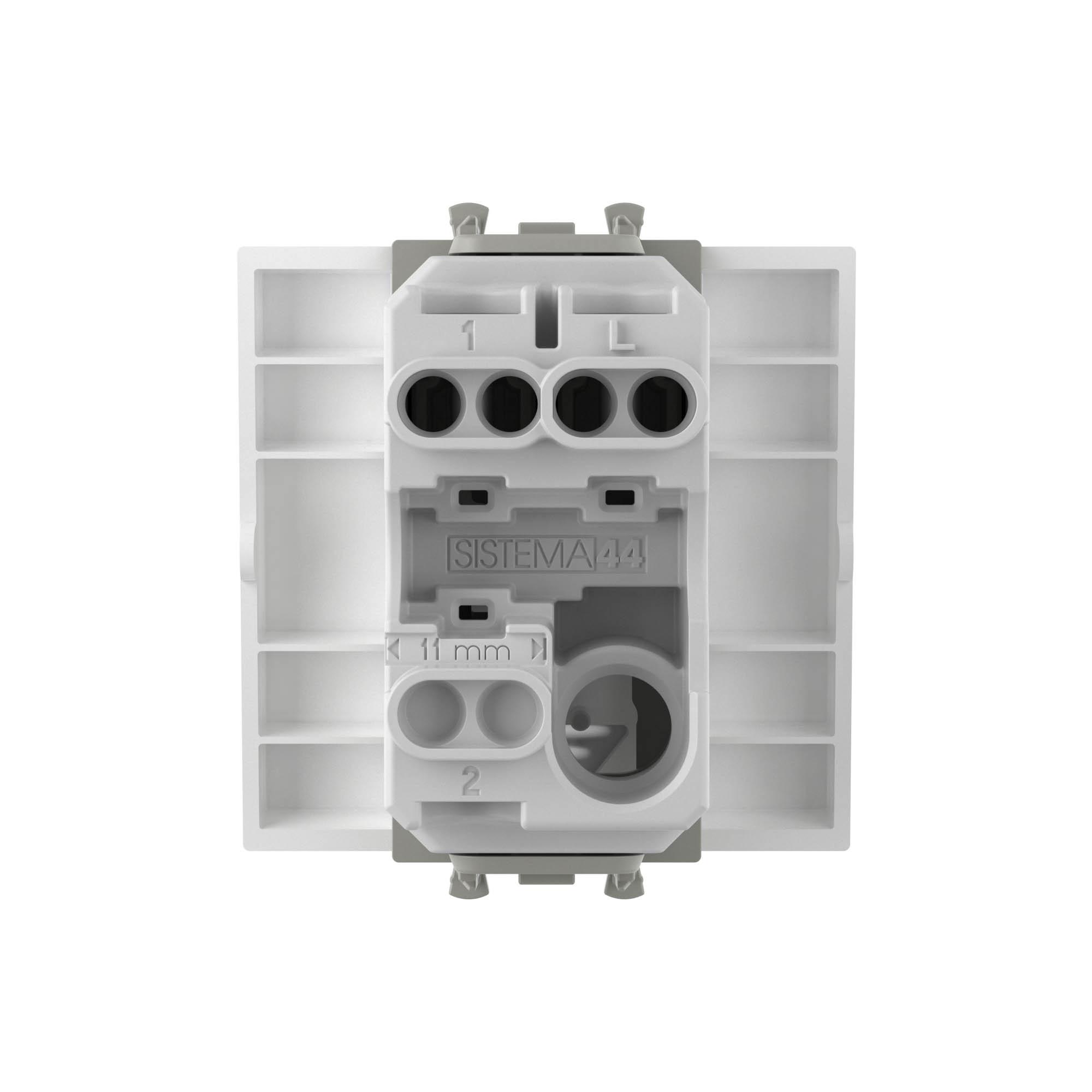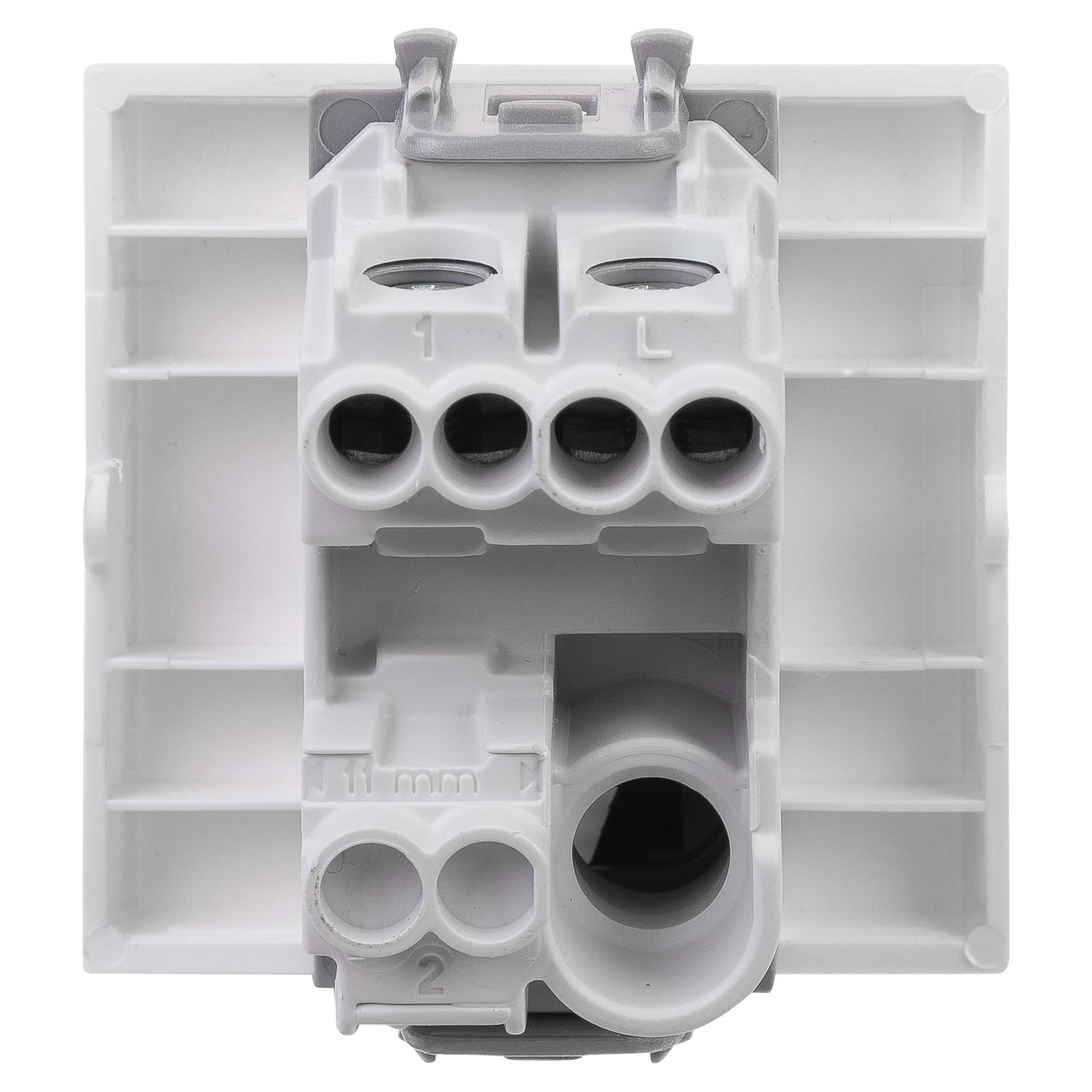 Выключатель одноклавишный однополюсный, модульный. Предназначен для монтажа в систему пластиковых коробов «In-liner Front» и систему организации рабочих мест «Сотто» (Sotto) при помощи рамок-суппортов и каркасов «Avanti» (код 4400912 и т. д.); используется для включения/выключения освещения. Характеристики: диаметр отверстий для ввода кабелей — 3 мм (по 2 отверстия на одну клемму); винтовые зажимы; шаблон для зачистки кабеля — 11 мм; номинальный ток — 16 A; номинальное напряжение — 230 В; возможна фиксация в подрозеточные коробки при помощи каркаса с лапками (код 4400802) и саморезов. 2 модуля. Цвет: «Белое облако». Производитель оставляет за собой право вносить во внешний вид изделия изменения, которые не влияют на его функционал, безопасность и надёжность.