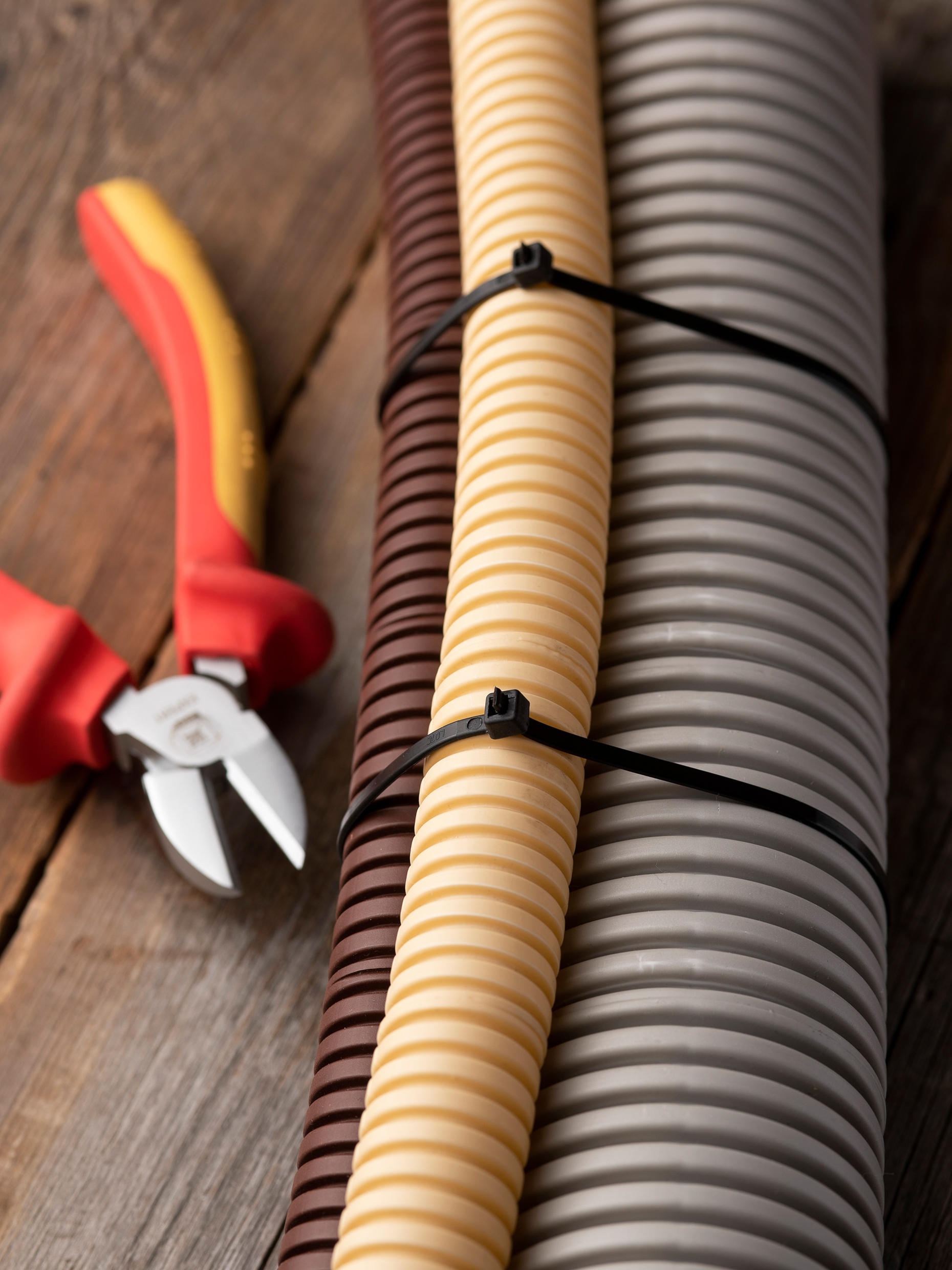FlexLock в пакетах для розницы по 50 штук расфасованы хомуты белого или черного цвета. Пакеты имеют удобную и надежную застежку Zip Lock. Кабельные стяжки FlexLock изготовлены из высококачественного самозатухающего нейлона 6.6 DuPont, не содержащего галогенов. Они могут использоваться внутри и снаружи помещений и эксплуатироваться при температуре в диапазоне от -40 до +85 °C. Отличаются высокой прочностью и надежностью замков.