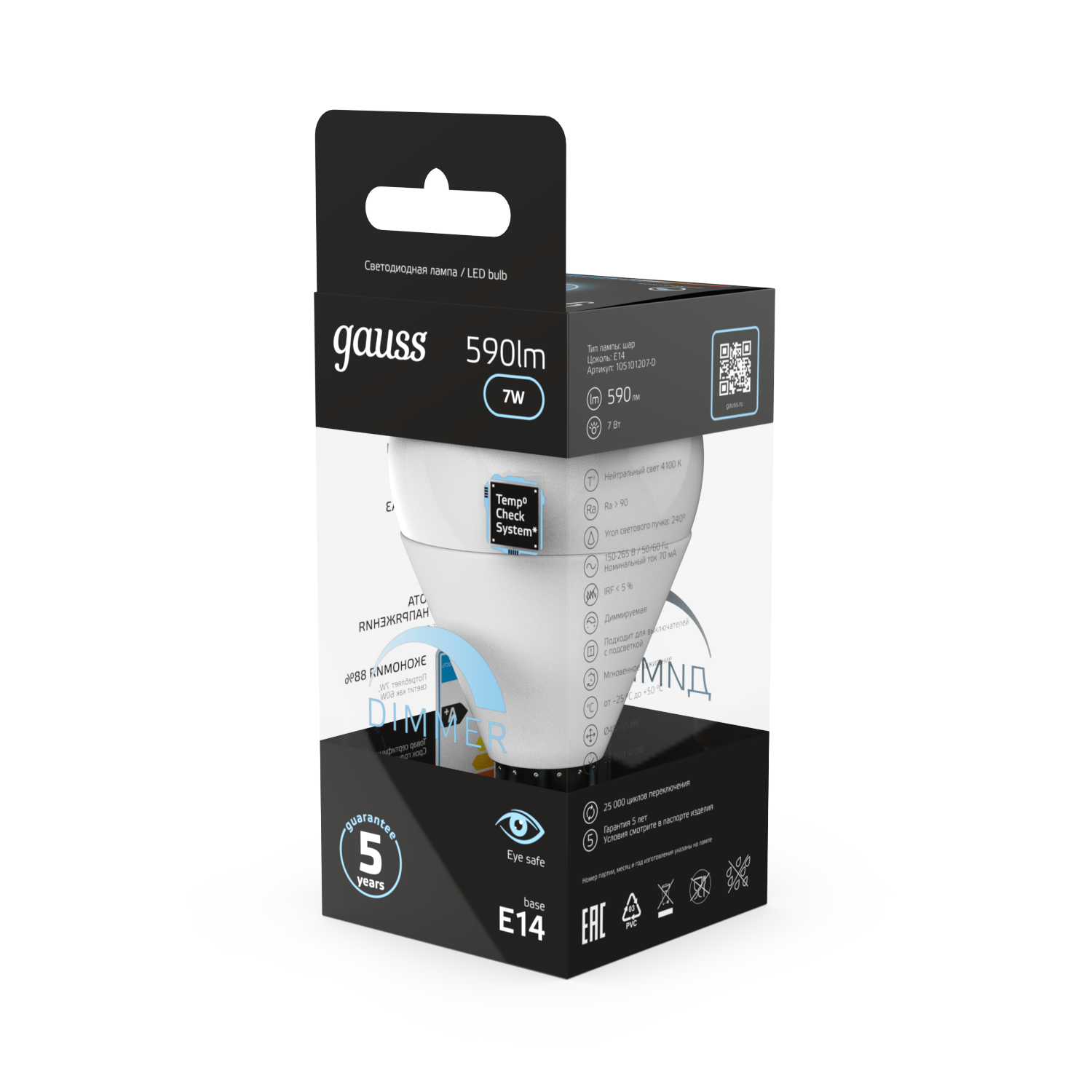 Название производителя: Лампа Gauss Шар 7W 590lm 4100К Е14 диммируемая LED 1/10/100