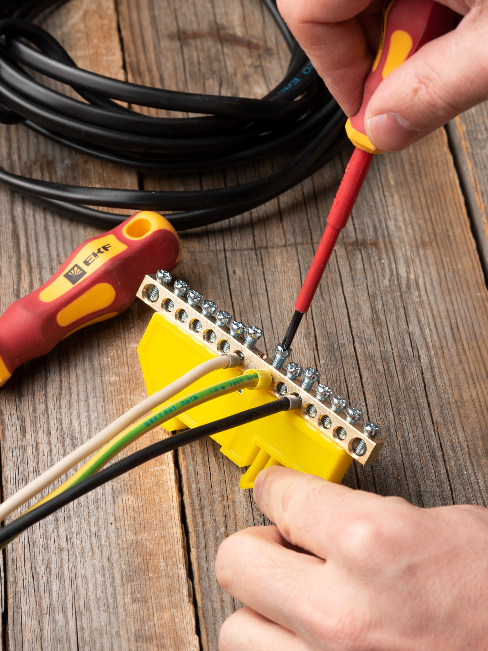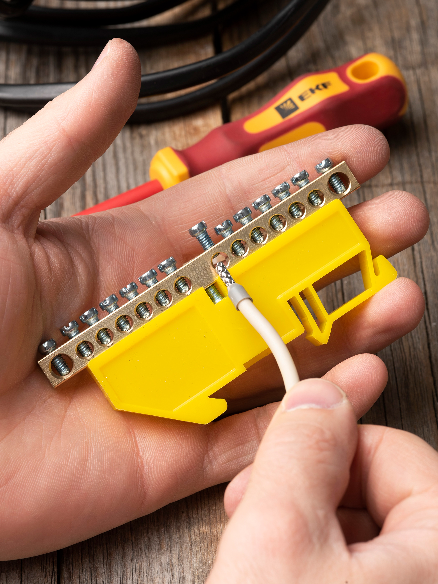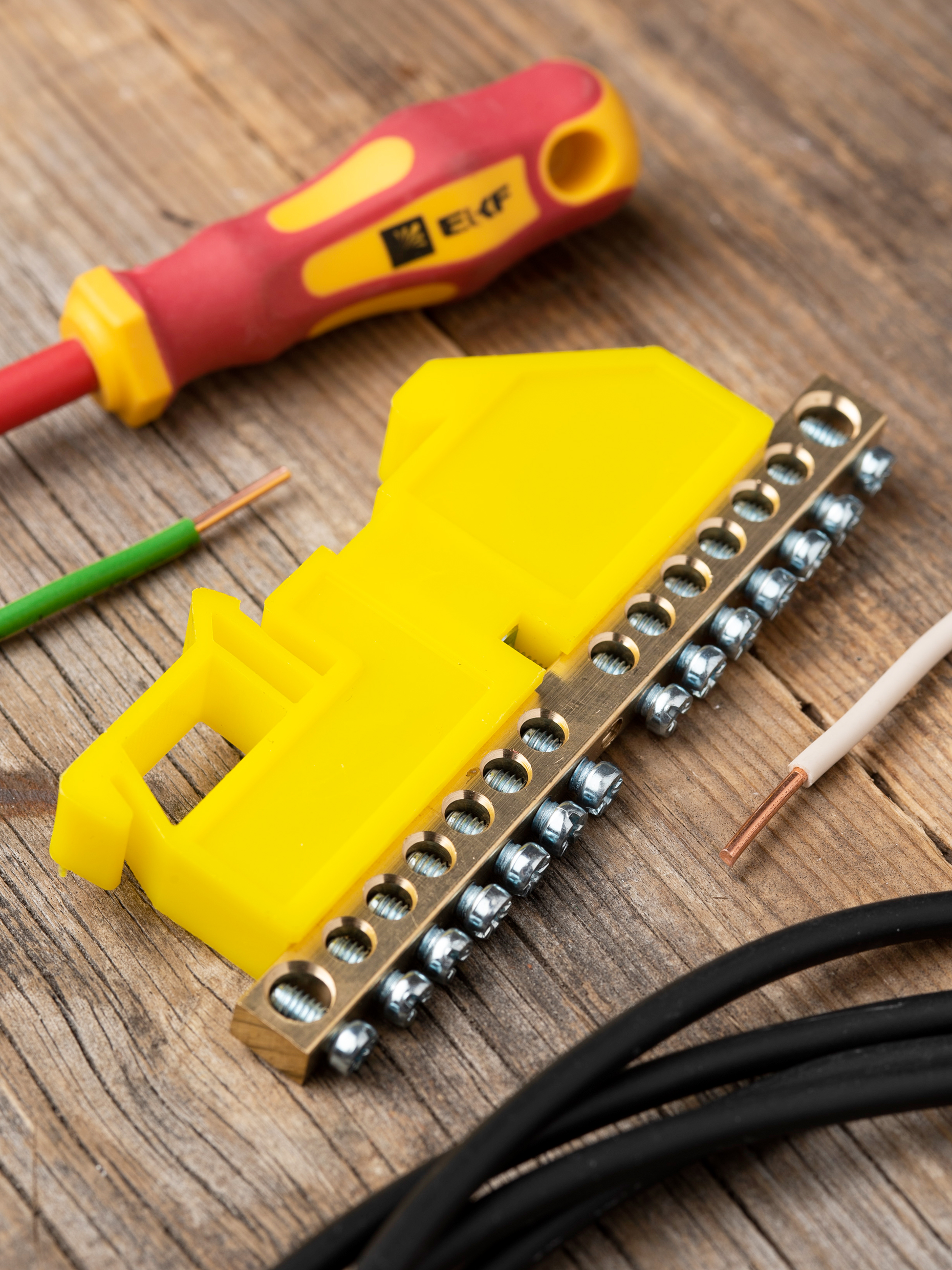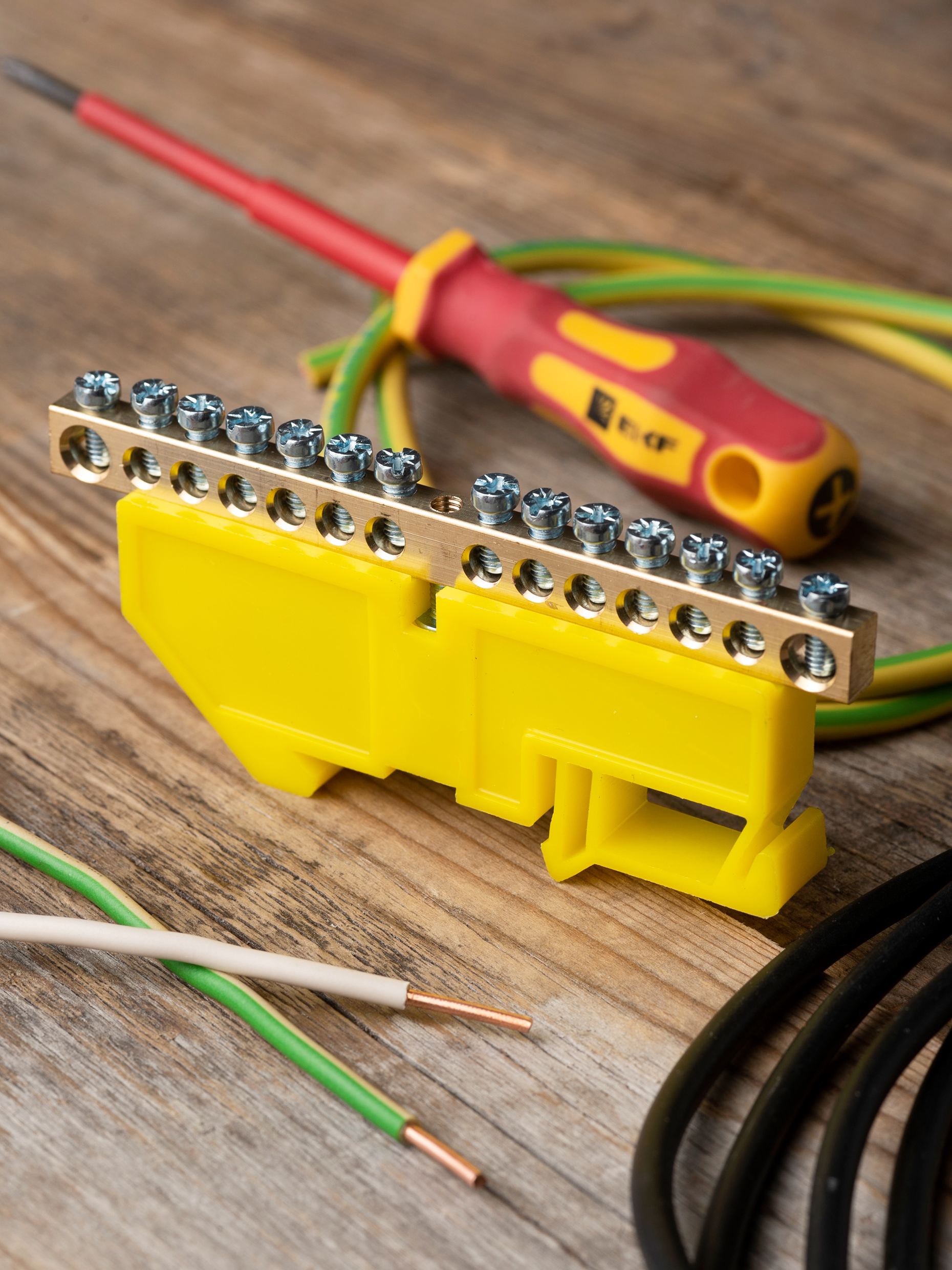 EKF PROxima Шина "0" N (6х9мм) 14 отверстий латунь желтый изолятор на DIN-рейку.