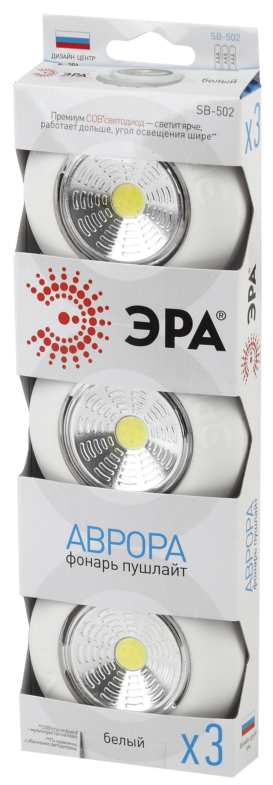 Название производителя: Светодиодный фонарь подсветка ЭРА Пушлайт SB-502 Аврора самоклеящийся 3шт белый COB