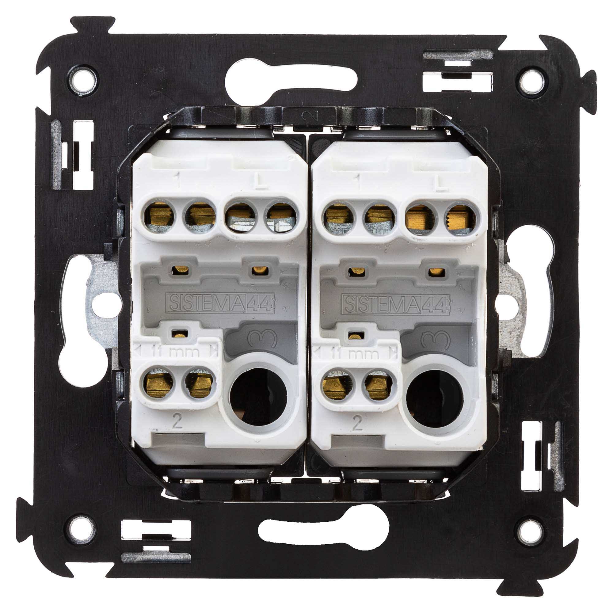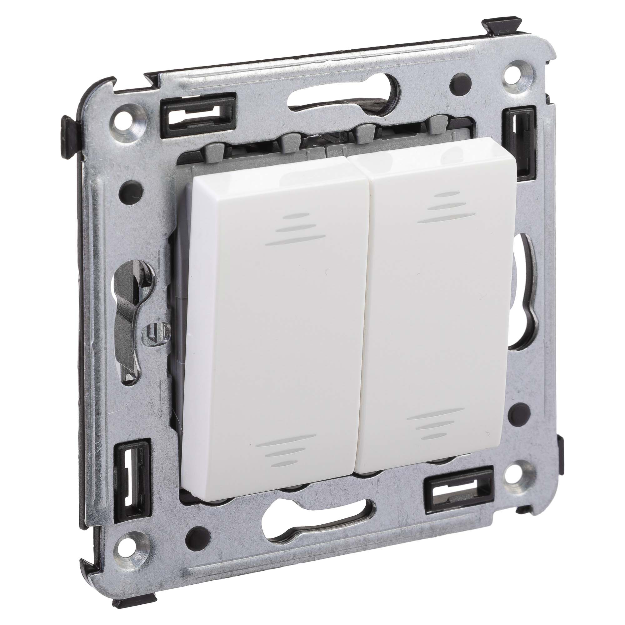 Задача двухклавишного переключателя – управление двумя контурами освещения из двух точек. Он позволяет включить/выключить освещение двумя светильниками из удобной точки – например, в спальне переключатель может размещаться возле кровати. Переключатель предназначен для скрытого монтажа в стену. Номинальное напряжение – 230 В, номинальный ток – 16 А.