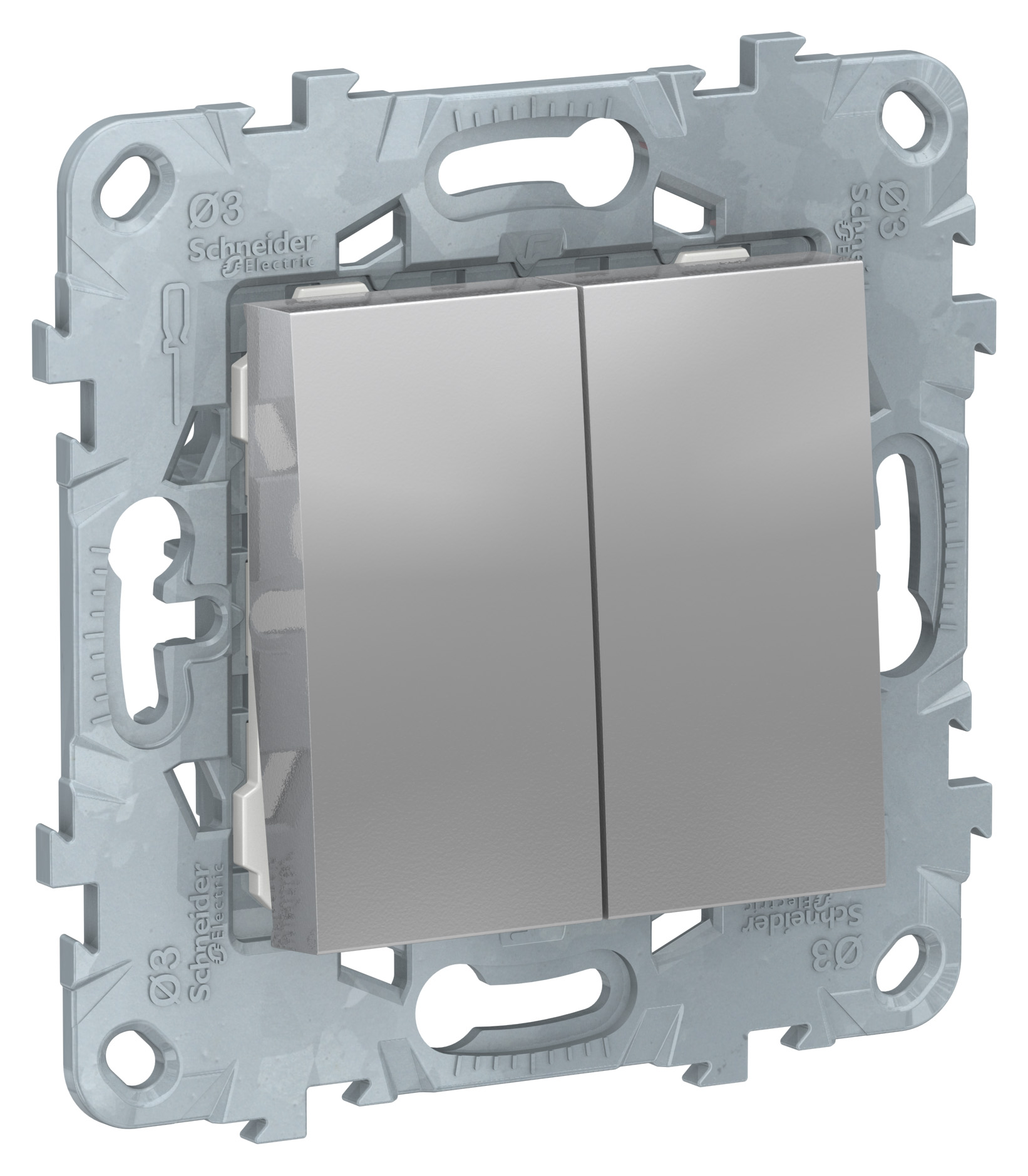 Выключатель двухклавишный Schneider Electric UNICA NEW (алюминий) без подсветки предназначен для сетей до 250 В на ток до 10 А.