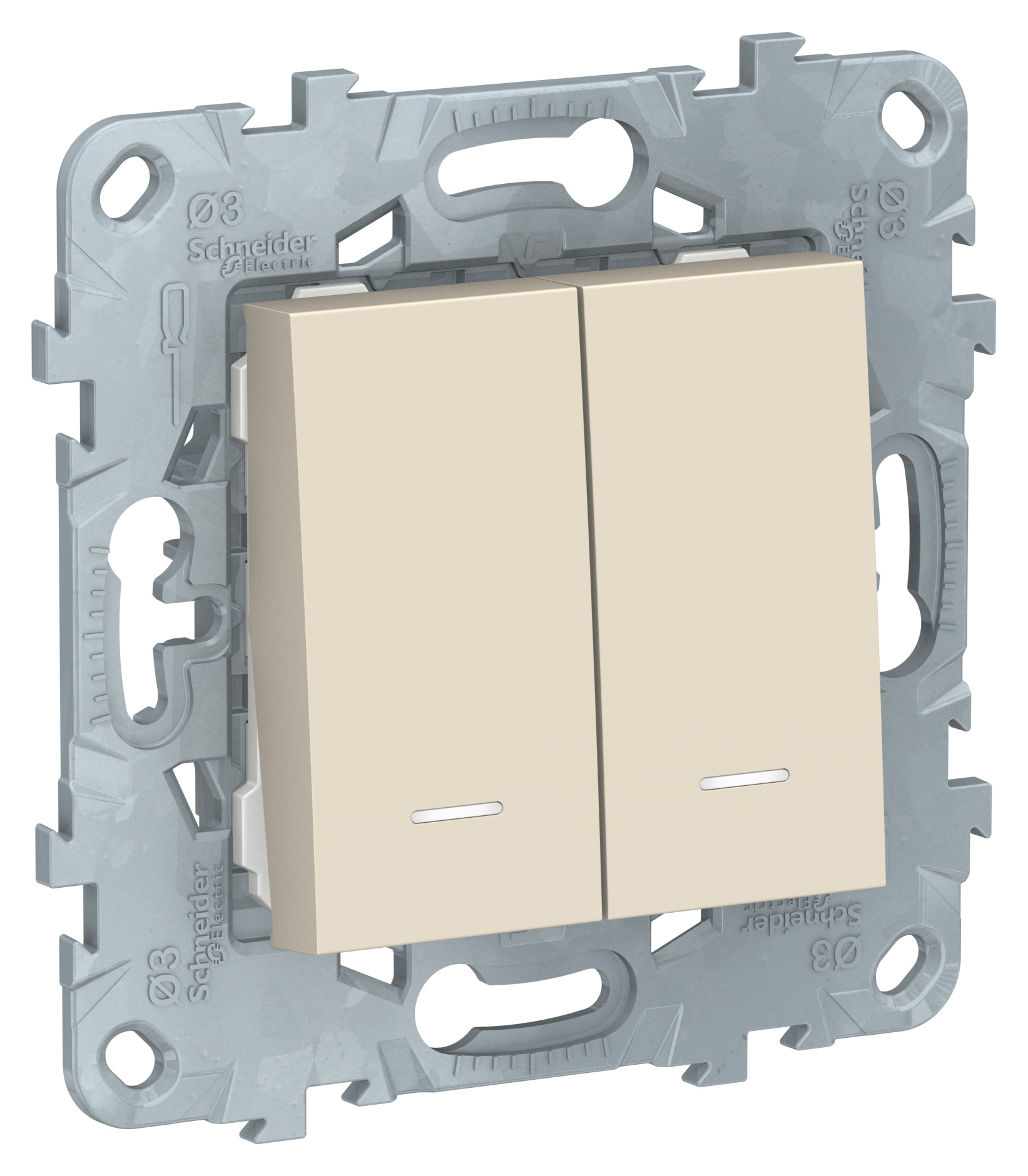 Переключатель двухклавишный Schneider Electric UNICA NEW (бежевый) с подсветкой предназначен для сетей до 250 В на ток до 10 А.