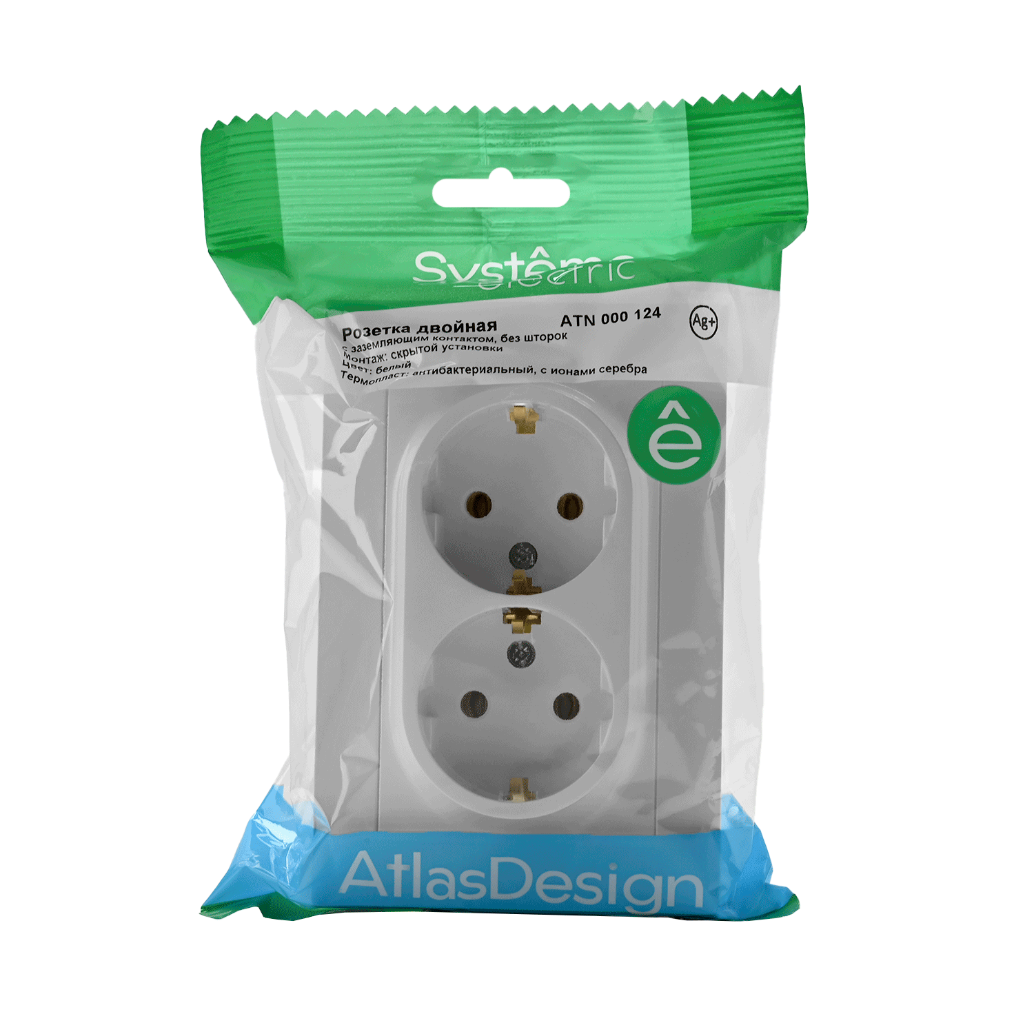 Розетка двойная в сборе Systeme Electric (ранее Schneider Electric) серии AtlasDesign в цвете белый с заземлением, без шторок подходит для сетей 250 В, на ток 16 А. Пластик с ионами серебра обеспечивает антибактериальный эффект. Заземляющий контакт обеспечивает дополнительную защиту от удара электрическим током. Лицевые детали из качественного ABS-пластика, устойчивого к царапинам и УФ-излучению. Двойная розетка позволяет подключить два устройства в одном месте. Изделие поставляется в комплекте с рамкой того же цвета.
