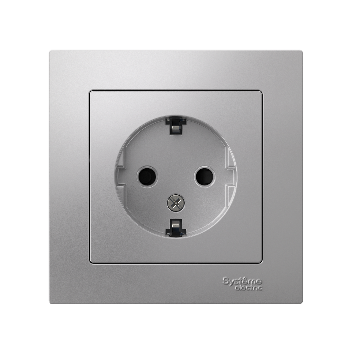 Розетка в сборе Systeme Electric (ранее Schneider Electric) серии AtlasDesign в цвете алюминий одинарная с заземлением и со шторками подходит для сетей 250 В, на ток 16 А. Заземляющий контакт обеспечивает дополнительную защиту от удара электрическим током. При наличии заземления электрический потенциал уходит в землю, защищая человека. Лицевые детали из качественного ABS-пластика, устойчивого к царапинам и УФ-излучению. Изделие поставляется в комплекте с рамкой того же цвета.