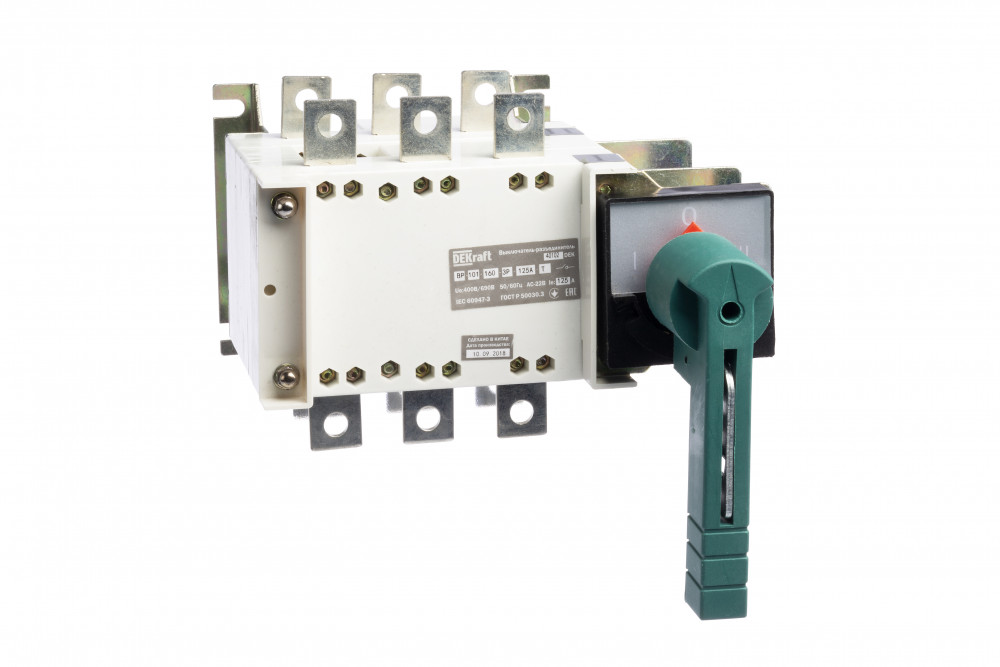 Выключатель-разъединитель серии ВР-101 тип WT DEKraft; 3P; реверсивный, тип Т (Тандем); с видимым разрывом; номинальный ток 400 А; типоразмер 630; ном.напряжение до 690 В, 50 Гц; категория применения - АС-22В (смешанные активные и индуктивные нагрузки). Двойной разрыв контактов обеспечивает надежное гашение дуги и снижает риск повреждений. Подвод питания возможен как сверху, так и снизу аппарата. Медные клеммы обеспечивают высокую электрическую проводимость и удобство подключения проводников.