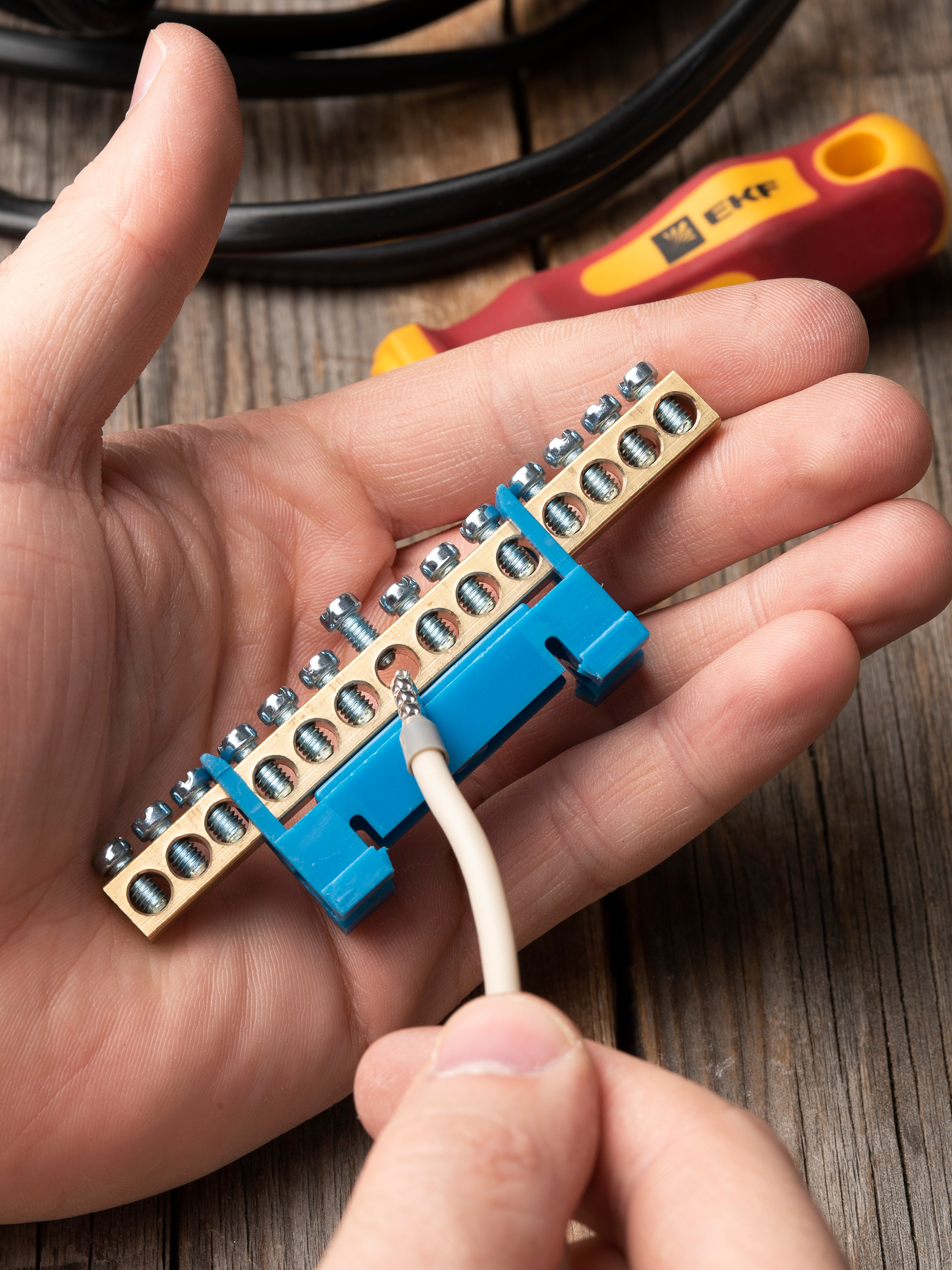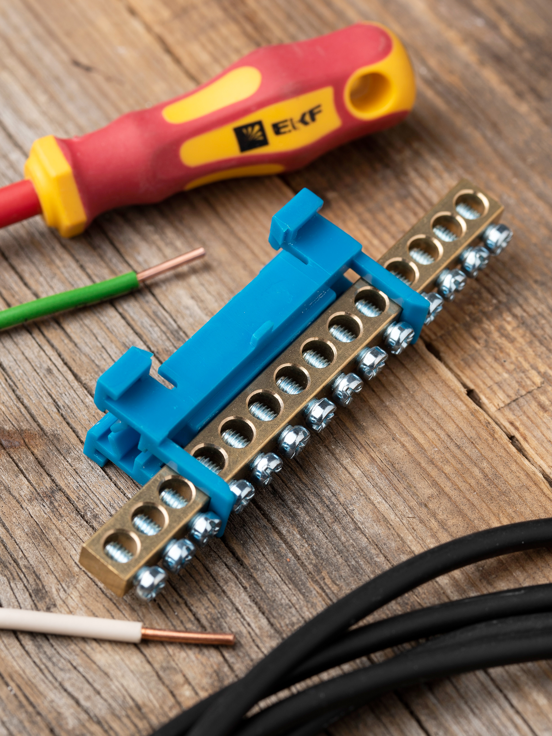 EKF PROxima Шина "0" N (6х9мм) 14 отверстий латунь синий изолятор тип "Стойка" на DIN-рейку.