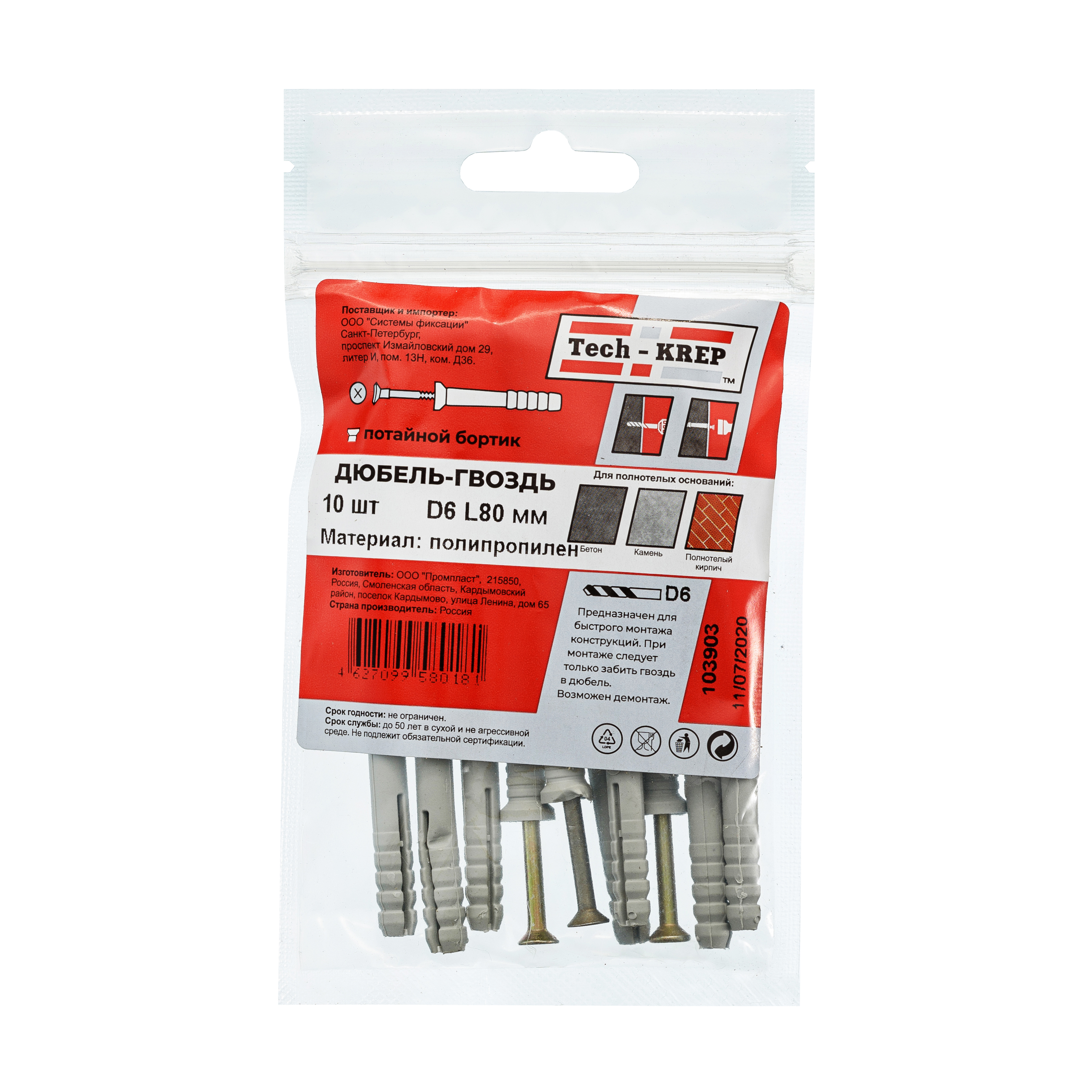 Название производителя: Дюбель-гвоздь 6х80 пот. манжета (полипропилен) (10 шт) - пакет Tech-Krep