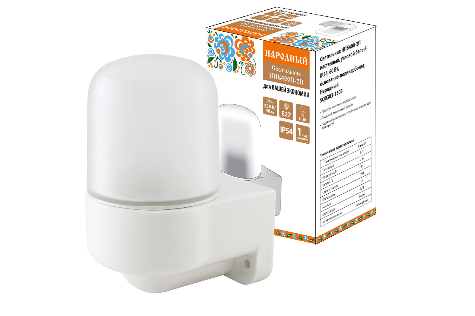 Название производителя: Светильник НПБ400-2П настенный, угловой белый, IP54, 60 Вт, основание-поликарбонат, Народный