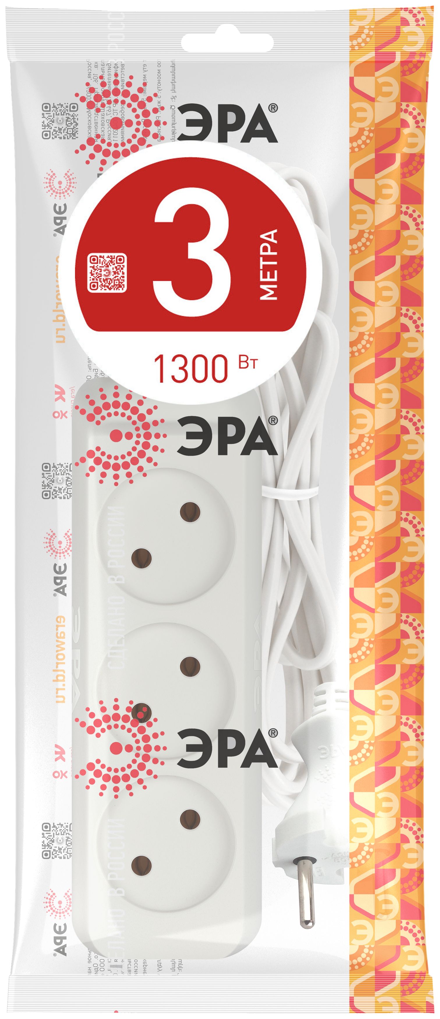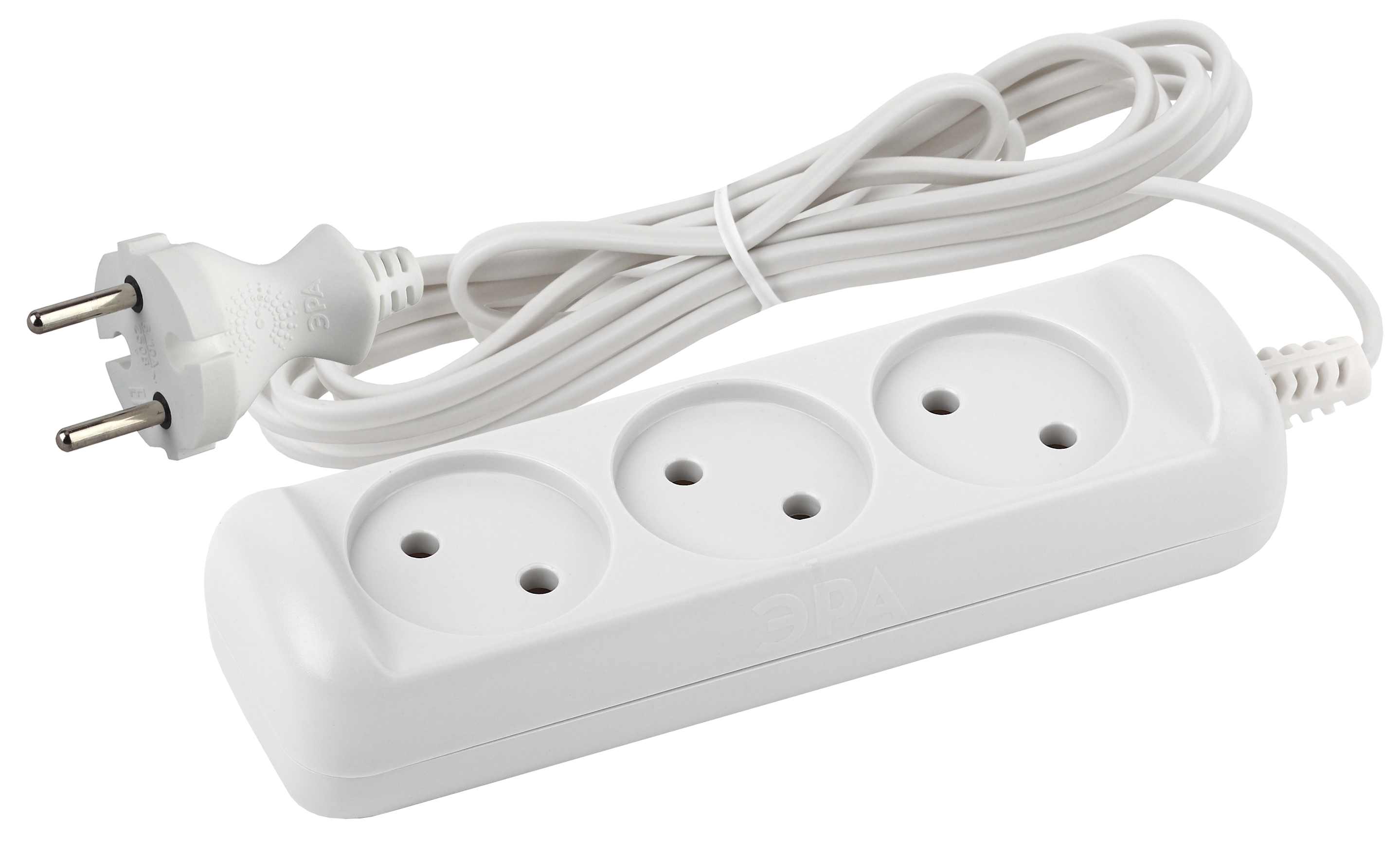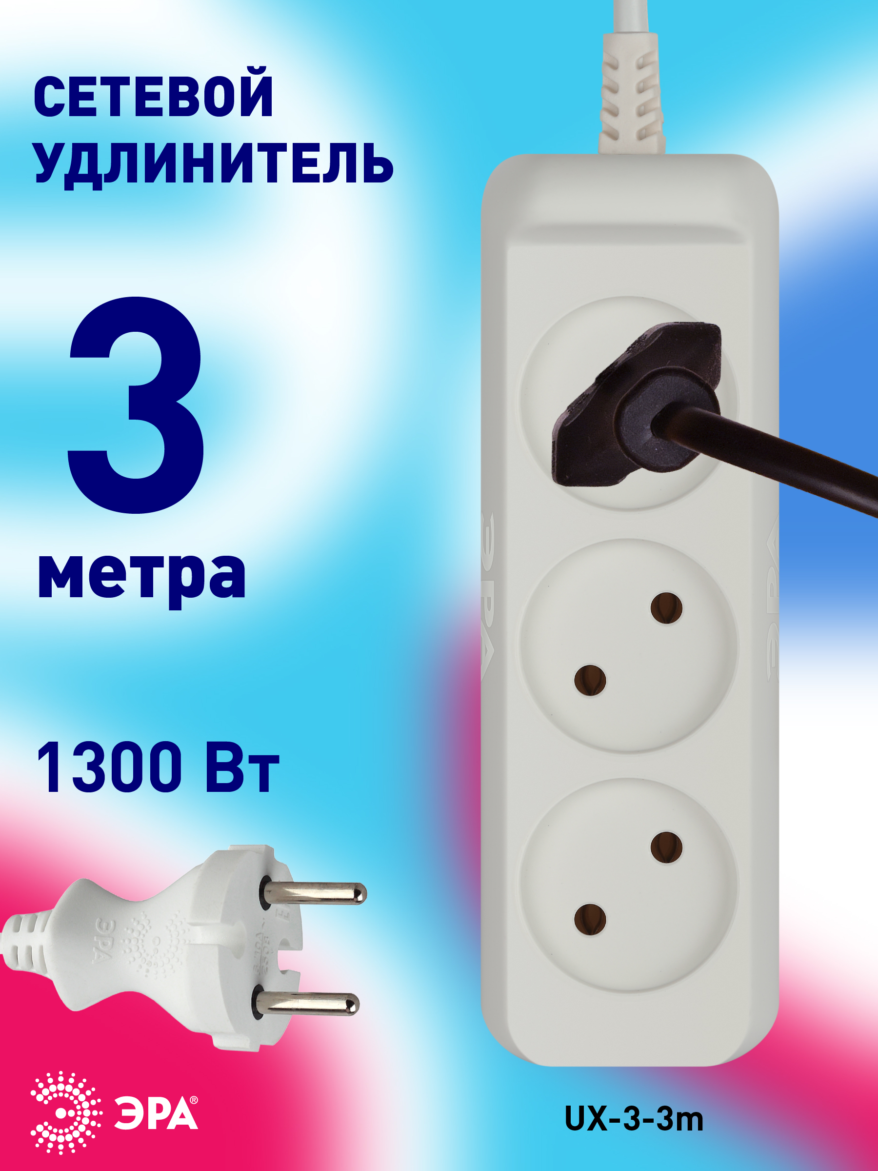 Бытовой удлинитель ЭРА UX-3-3m на 3 розетки, без заземления, с удлинённым проводом ШВВП 3 метра. Рассчитан для подключения простых бытовых приборов стандартной мощности. Максимальная нагрузка - 6 A/ 1300 Вт. Базовый белый цвет, аккуратный дизайн с закруглёнными углами. Для комфорта и безопасности гнёзда слегка "утоплены" в корпус. Изготовлен из надёжного полипропилена со специальными антипиренами, препятствующими горению.
