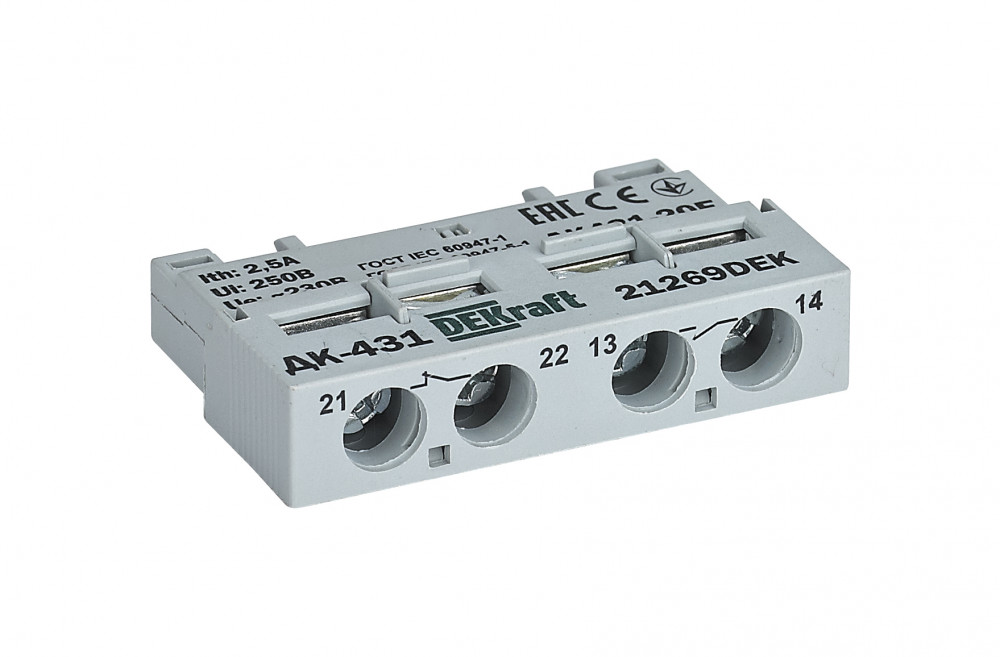 Дополнительные контакты серии ДК-431 F DEKraft; фронтальная установка; кол-во и тип контактов - 1НО+1НЗ; ток терм. стойкости 2,5 А. Дополнительные контакты серии ДК-431 F предназначены для сигнализации о состоянии главных контактов автоматических выключателей ВА-431: включены - выключены. Переключение контактов ДК-431 F происходит, даже если рукоятка управления выключателя удерживается во взведенном положении.