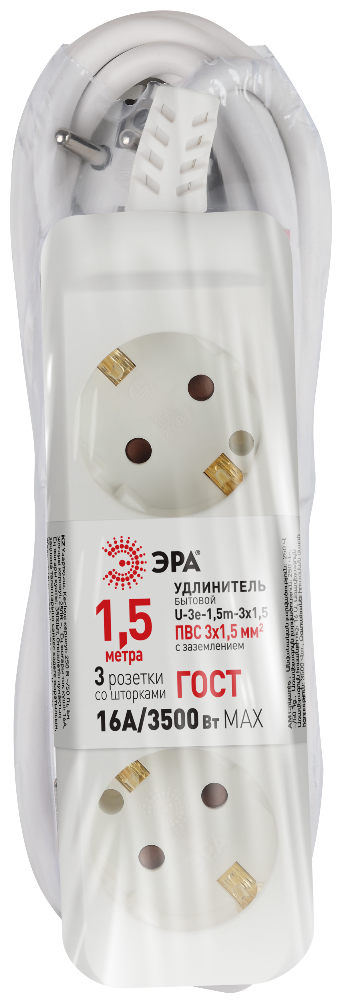 Удлинитель электрический Эра U-3e-1,5m-3x1,5 с заземлением, 3 розетки, 1,5м ПВС 3x1,5мм2. Для мощных приборов. Рассчитан на максимальную мощность 16А/3500. Удлинитель Эра станет Вашим надежным помощником, если Ваши любимые электроприборы находятся далеко от розеток.