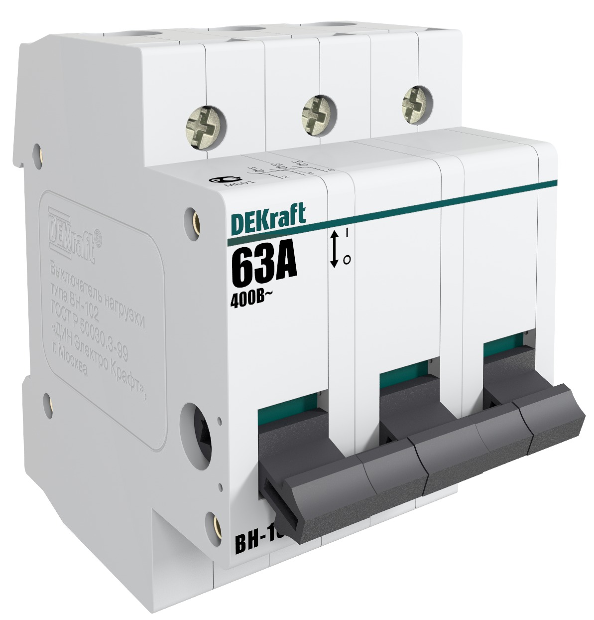 Выключатель-разъединитель серии ВН-102 Dekraft; 3P; номинальный ток 32 А; установка – на DIN-рейку; установочное положение - любое. Выключатели-разъединители применяются для ручного включения/отключения сетей напряжением до 400 В. Специальные мостиковые контакты обеспечивают надежный разрыв цепи; они полностью исключают возможность перекрытия дугой по изоляции. Усиленная рукоятка управления обеспечивает большое количество включений/отключений.
