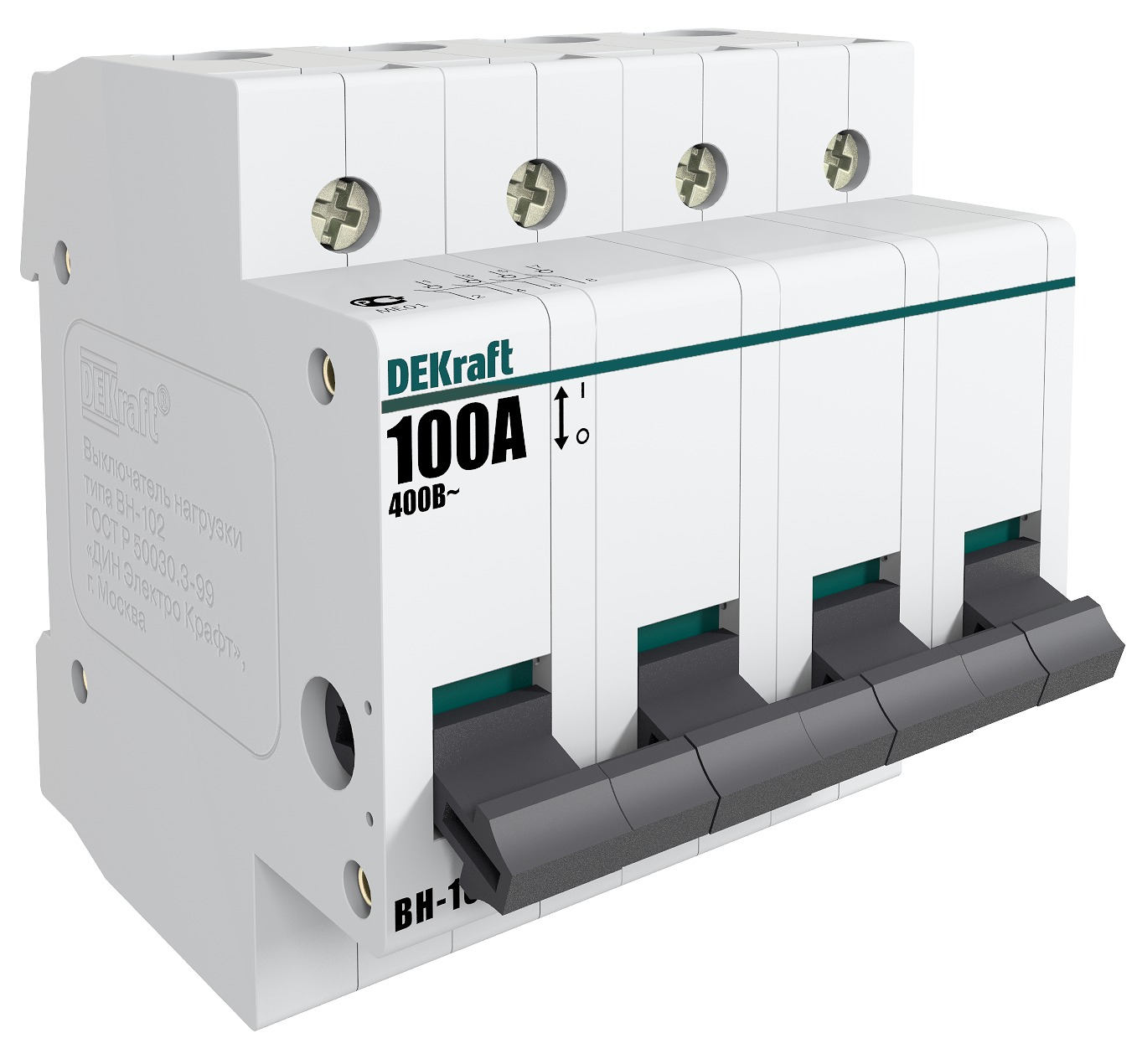 Выключатель-разъединитель серии ВН-102 Dekraft; 4P; номинальный ток 100 А; установка – на DIN-рейку; установочное положение - любое. Выключатели-разъединители применяются для ручного включения/отключения сетей напряжением до 400 В. Специальные мостиковые контакты обеспечивают надежный разрыв цепи; они полностью исключают возможность перекрытия дугой по изоляции. Усиленная рукоятка управления обеспечивает большое количество включений/отключений.