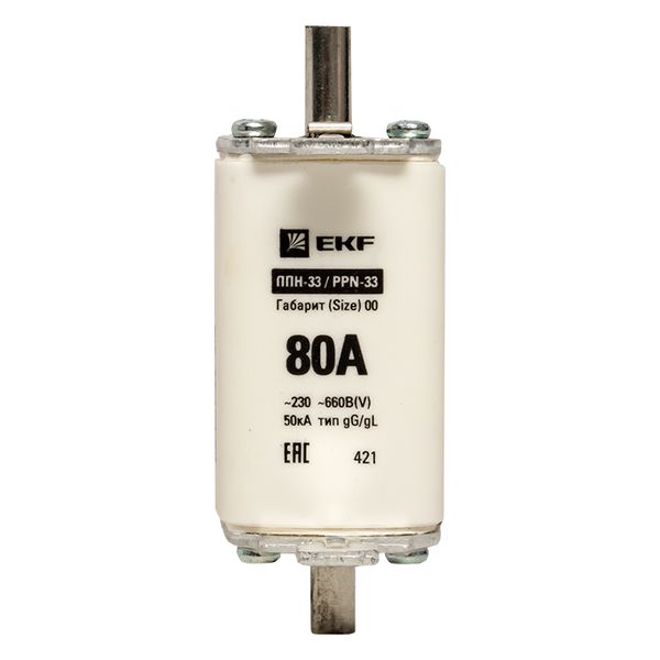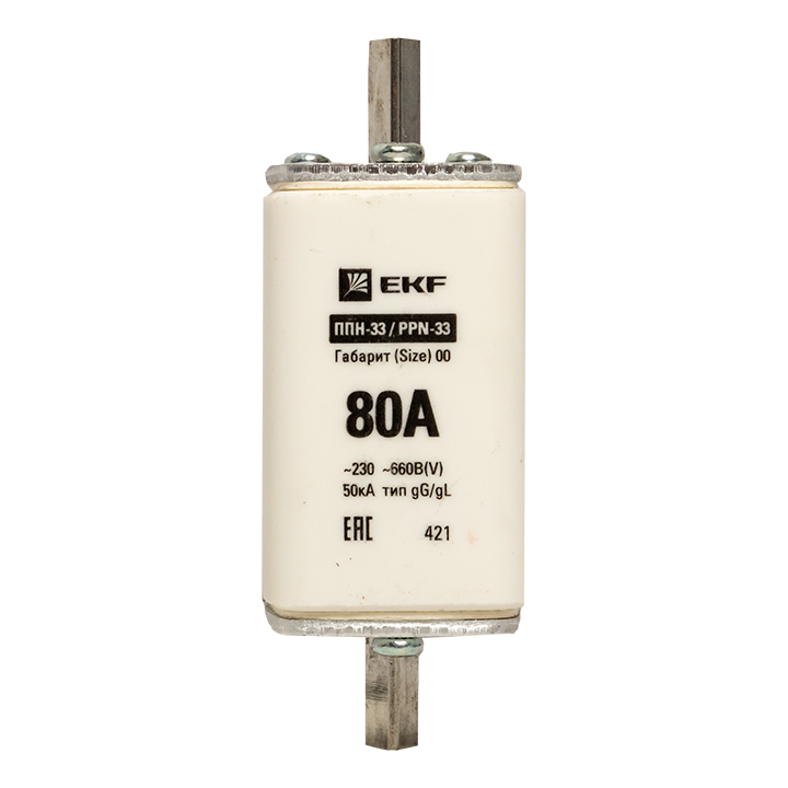 Плавкая вставка ППН-33 160/ 80А габарит 00 EKF. Предохранители плавкие ППН EKF, укомплектованные плавкими вставками типа gG/gL, предназначаются для защиты кабельных линий и промышленных электроустановок от токов перегрузки и короткого замыкания. Предохранители применяются в электрических сетях переменного тока частотой 50 Гц с напряжением до 660В. Применяются для крепления в распределительных и вводно-распределительных устройствах. Предохранители плавкие ППН могут устанавливаться в основание с держателем, а также в специально предназначенные рубильники. В комплект поставки предохранителей плавких ППН основание с держателем не входит и приобретается отдельно.