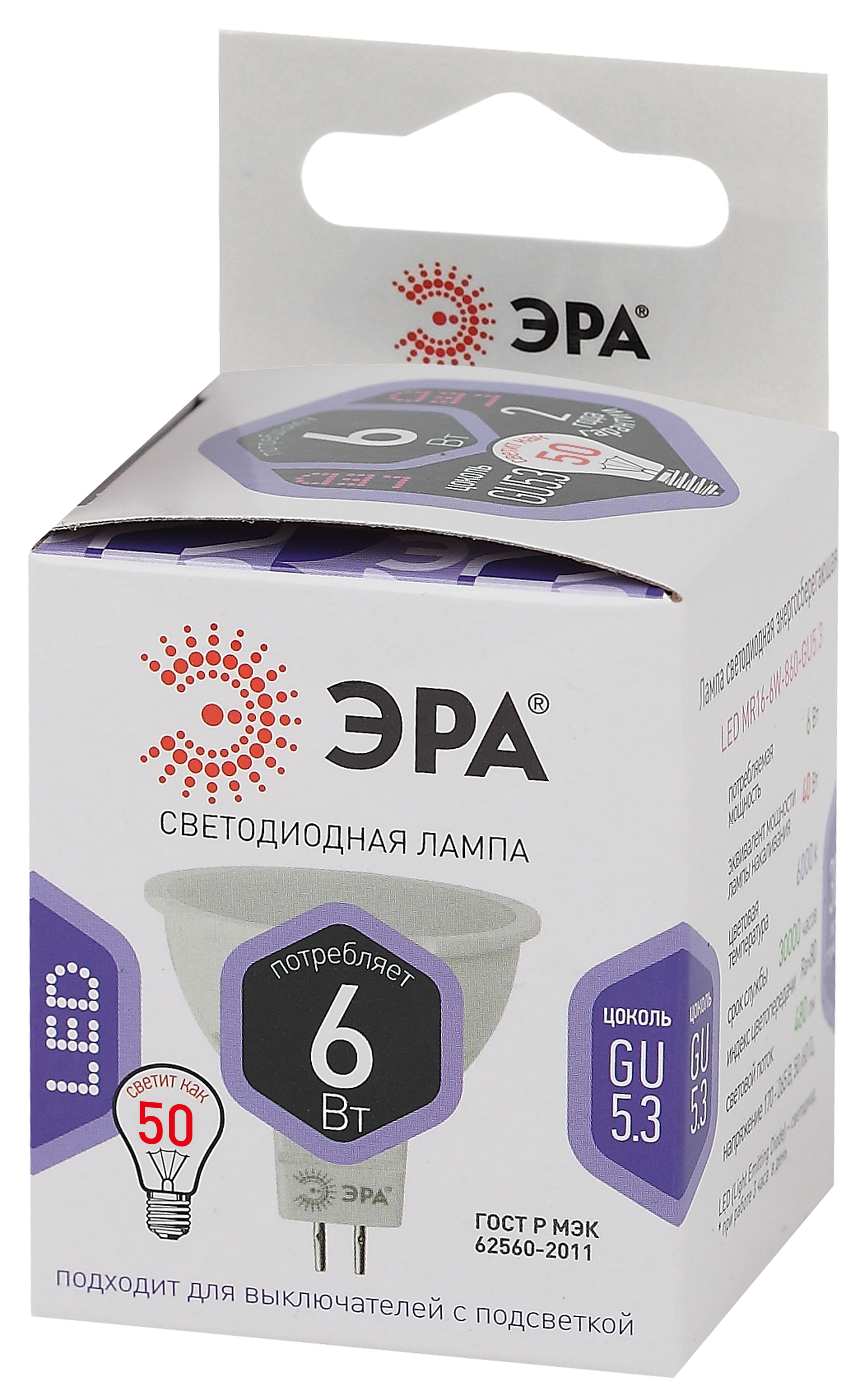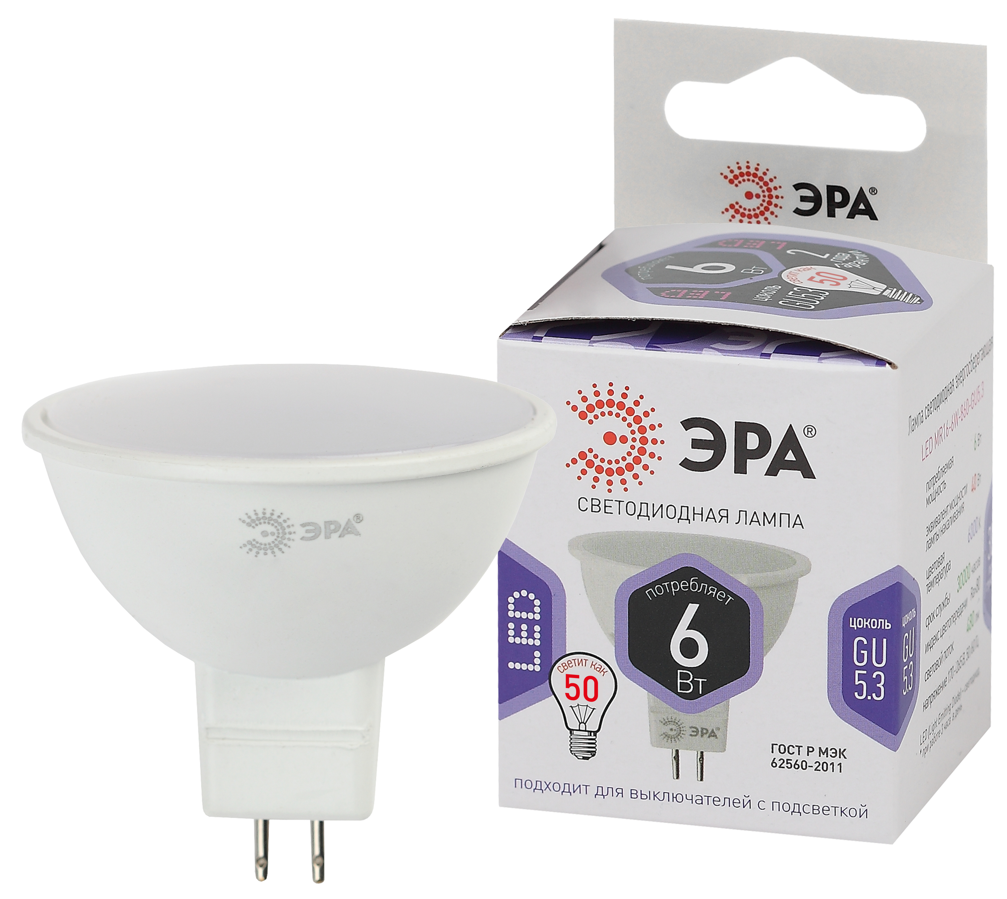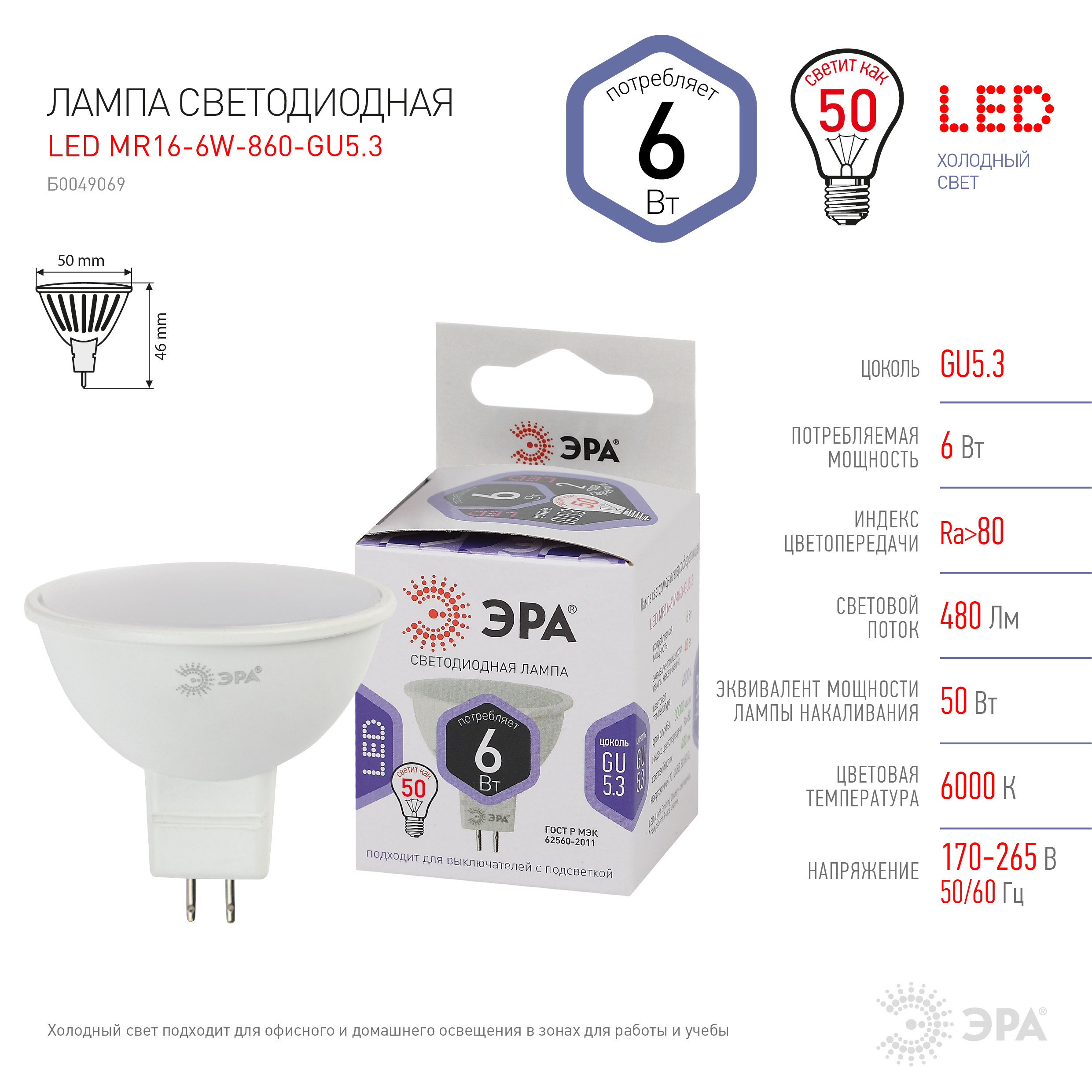 Название производителя: Лампа светодиодная ЭРА STD LED MR16-6W-860-GU5.3 6Вт софит холодный белый свет GU5.3