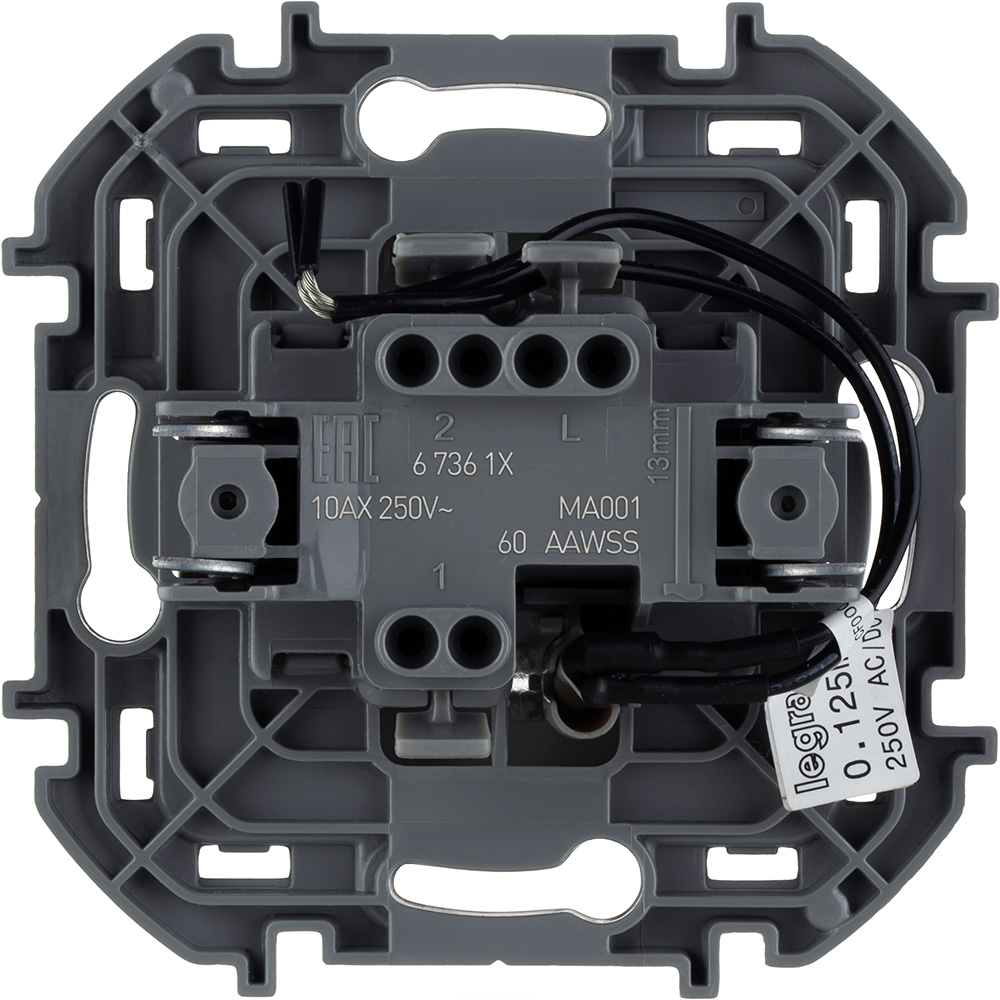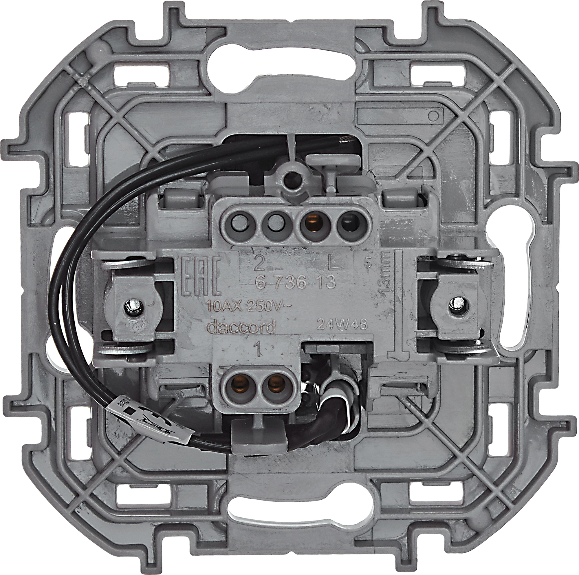 Выключатель одноклавишный с подсветкой/индикацией скрытого монтажа Legrand/Daccord Inspiria, цвет "Антрацит", номинальный ток 10АХ, напряжение ~250В, безвинтовые зажимы. Устанавливается в жилых и общественных помещениях для управления приборами освещения, вентиляции и т.д. Особенности изделия: - Возможность выбора режима работы светодиодной лампы, которой оснащен механизм: подсветка или индикация - Лампу подсветки/индикации можно заменить при необходимости (арт. производителя 764526) - Компактный механизм глубиной всего 20 мм без проблем размещается в монтажных коробках малой глубины - Материал клавиши - АБС: обладает высокой ударопрочностью, стоек к выгоранию и загрязнениям - Материал механизма и суппорта - высококачественный поликарбонат: обладает высокой электробезопасностью, термостабильностью и не поддерживает горение - Все токоведущие части выключателя имеют защиту от случайного прикосновения - Безвинтовые зажимы обеспечивают быстрое присоединение и отсоединение проводов с однопроволочными и многопроволочными жилами - Безвинтовые зажимы не требуют обслуживания, гарантируют надежное и долговечное соединение - Удобные широкие толкатели облегчают отсоединение провода - Улучшенная эргономика снижает вероятность искрения при коммутации светодиодных источников света - Ход клавиши короткий, негромкий
