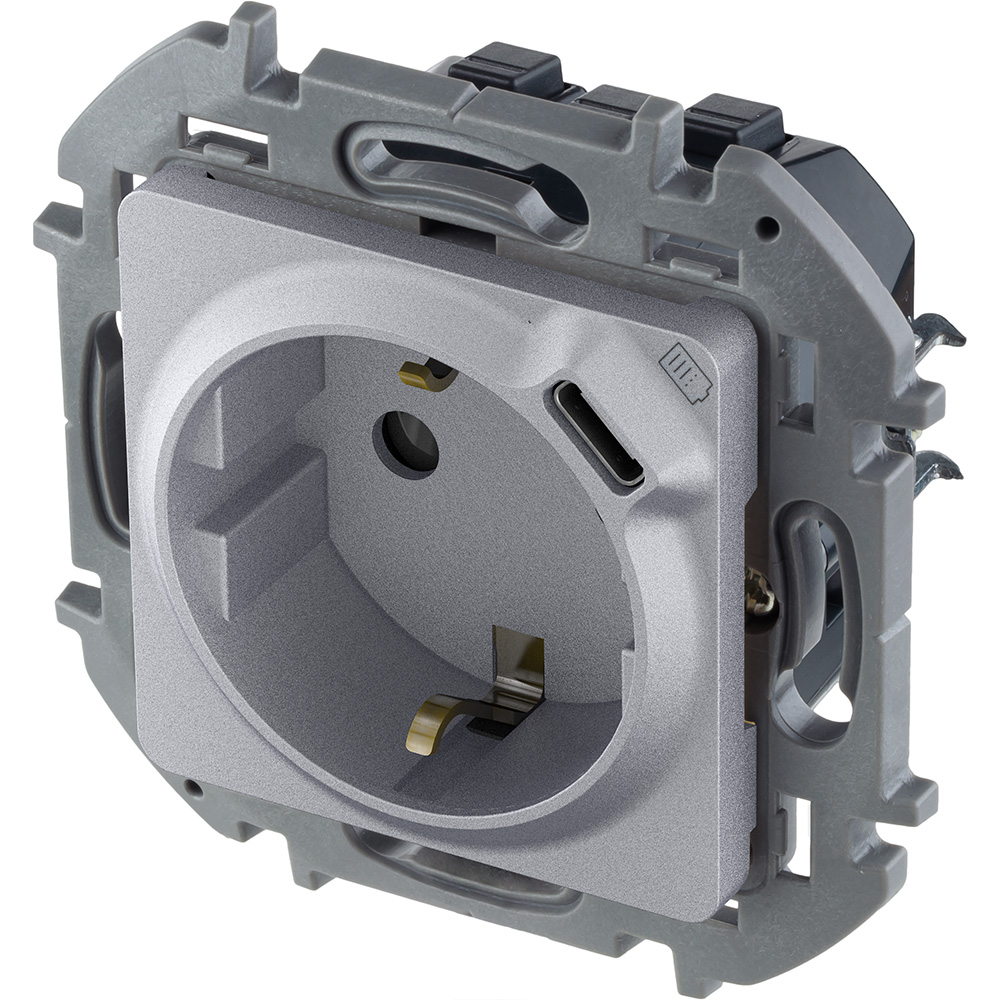 Комбинированная розетка 2К+З с зарядным устройством USB тип С Legrand Inspiria для скрытого монтажа, цвет "Алюминий". Максимальный ток розетки 16АХ, напряжение розетки ~250В, напряжение зарядного устройства =5В, максимальный зарядный ток 1500 мА.