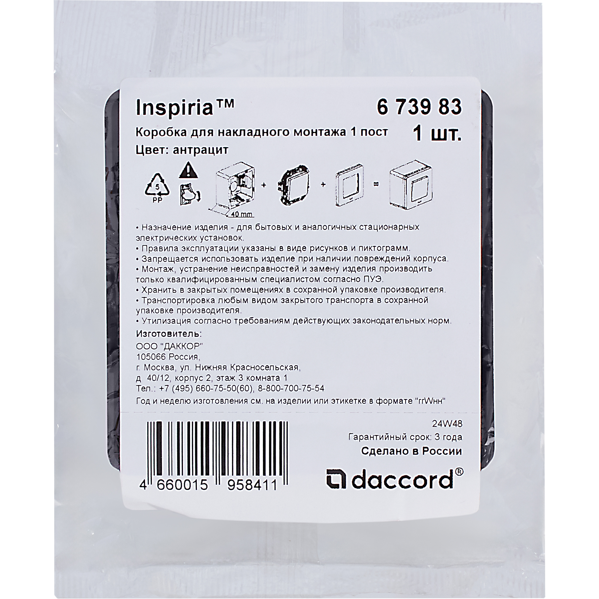 Название производителя: Коробка для накладного монтажа 1 пост - Legrand/Daccord Inspiria - антрацит