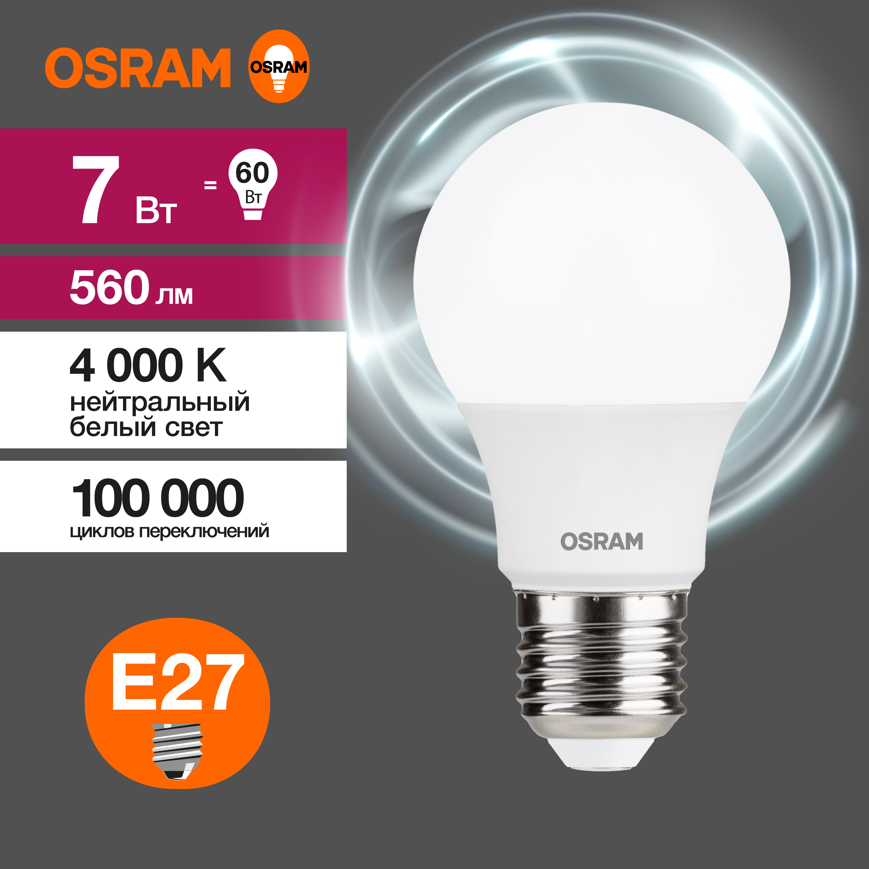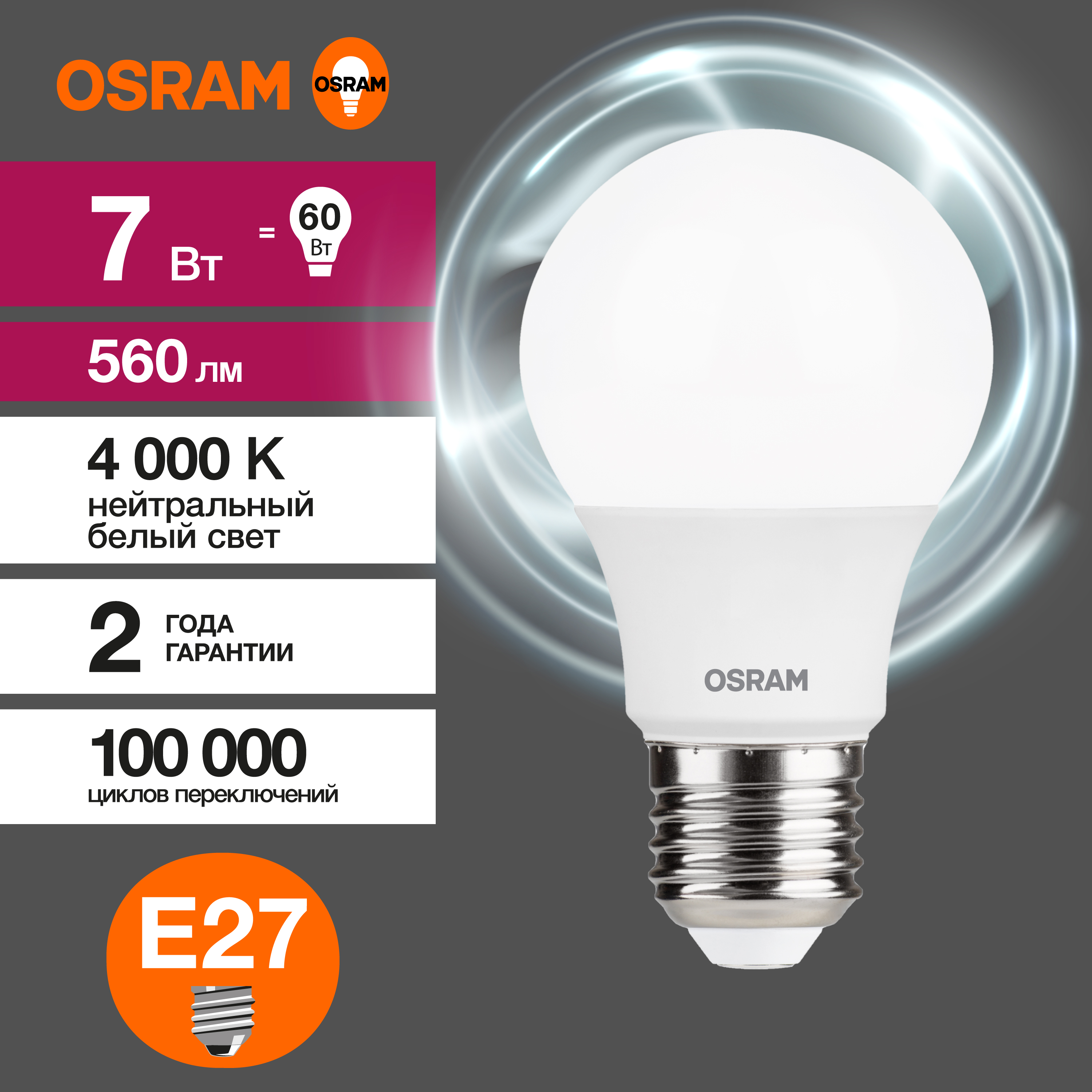 Лампа светодиодная OSRAM LED Value A, 560лм, 7Вт (замена 60Вт), 4000К (нейтральный белый свет). Цоколь E27, колба A, угол пучка 180. Исполнение колбы матовое, пластик. Напряжение питания 220-240В. Товар сертифицирован.