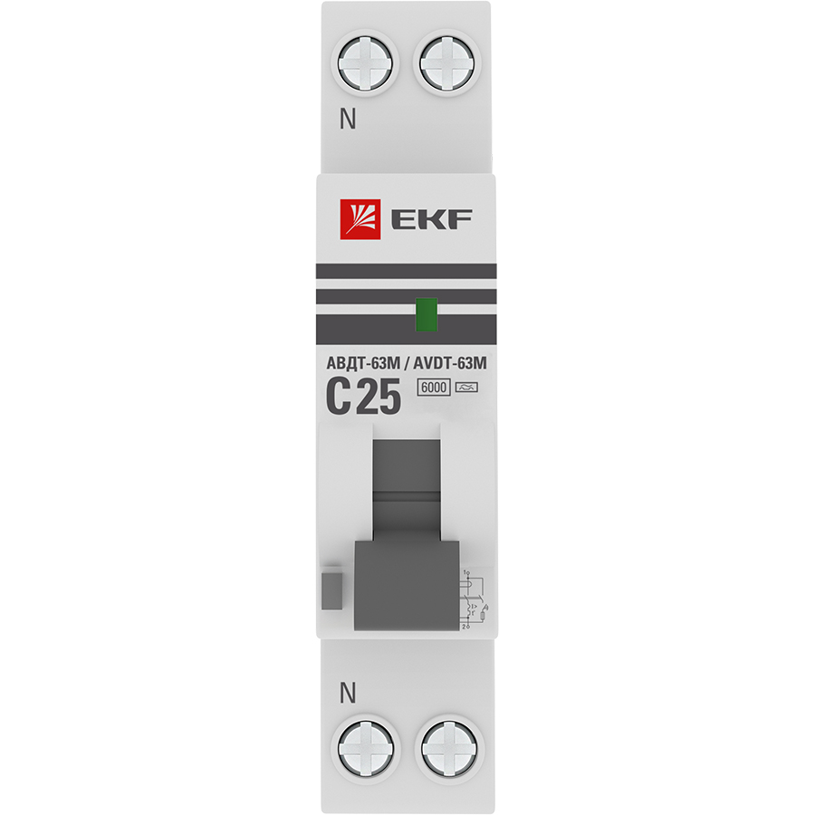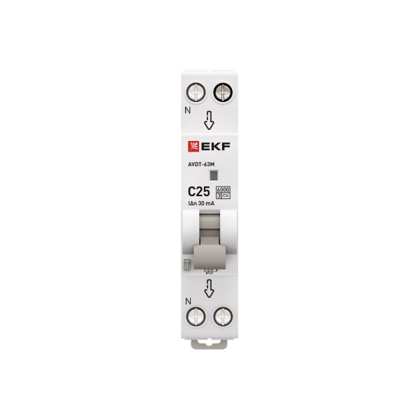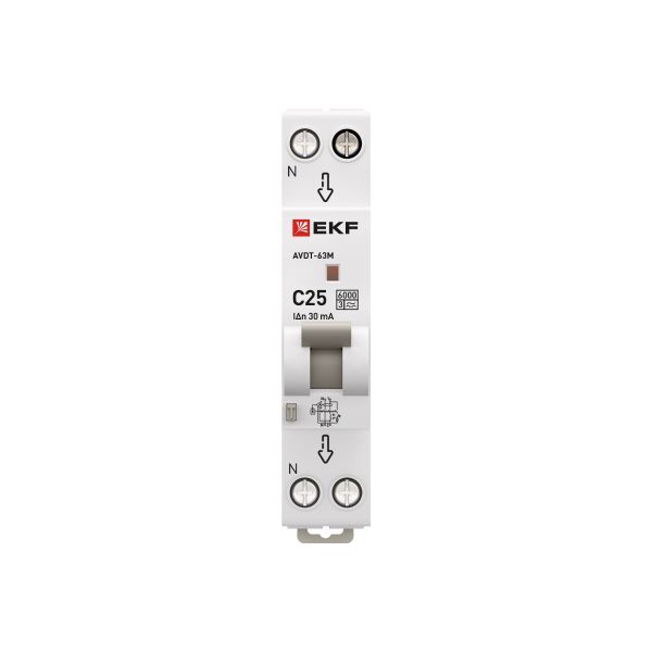 Название производителя: Автоматический выключатель дифференциального тока АВДТ-63М 1P+N 18мм 25А характеристика С 30мА тип A электронный 6кА PROXIMA EKF