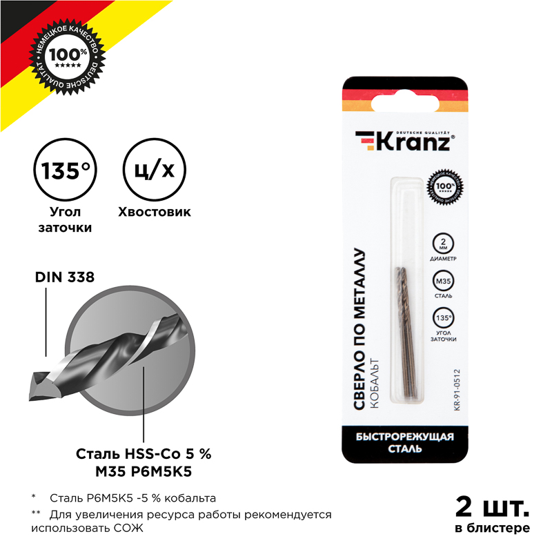 KRANZ Сверло по металлу 2x49x24мм "Кобальт" (сталь HSS-Co 5 % M35 P6M5K5) DIN 338, 2 шт. в блистере