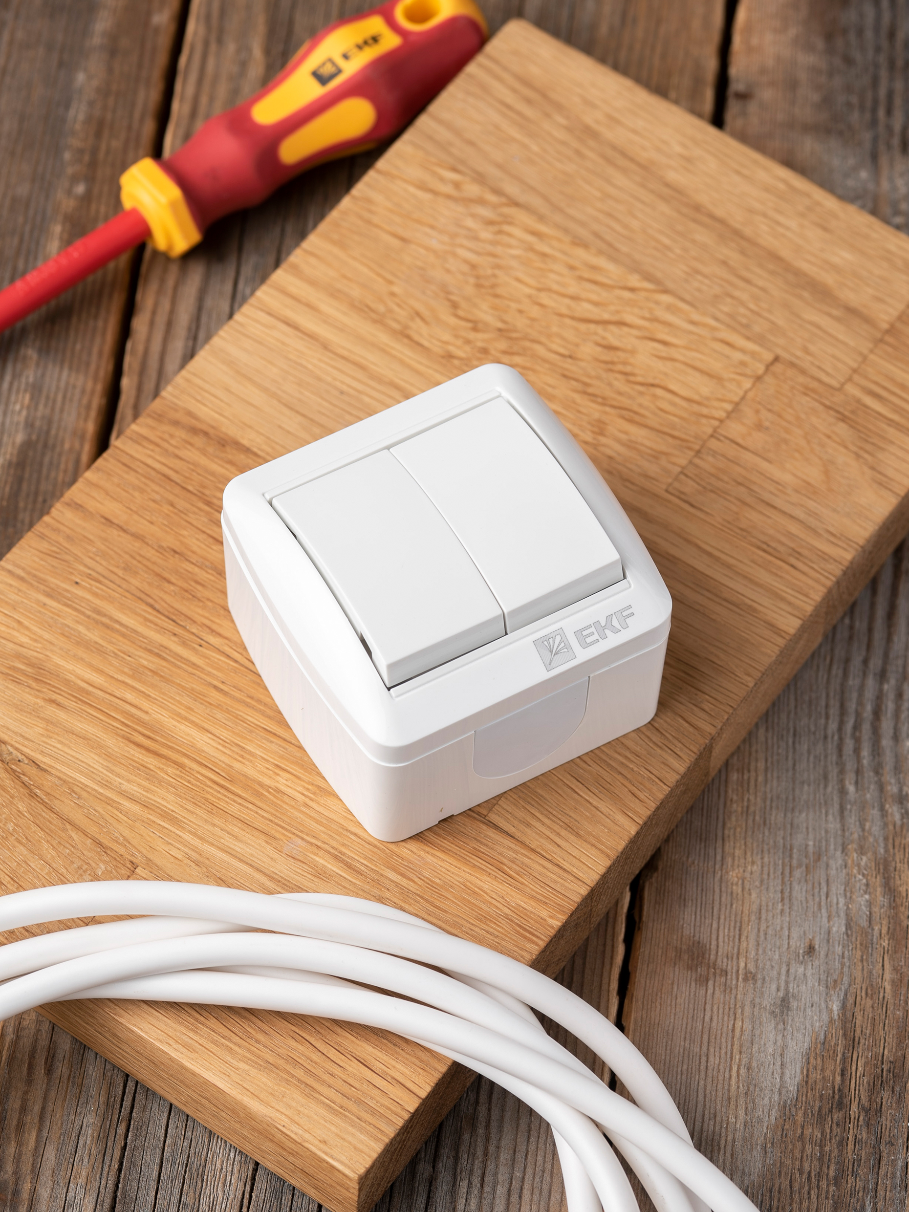 Выключатель двуклавишный EKF серии Владивосток позволяет организовать электроснабжение в условиях высокой влажности и пыльных помещениях, на улице при условии установки под навесом. Герметичные вводы с двух сторон изделия обеспечивают надежную защиту, позволяя использовать устройство в агрессивных условиях.