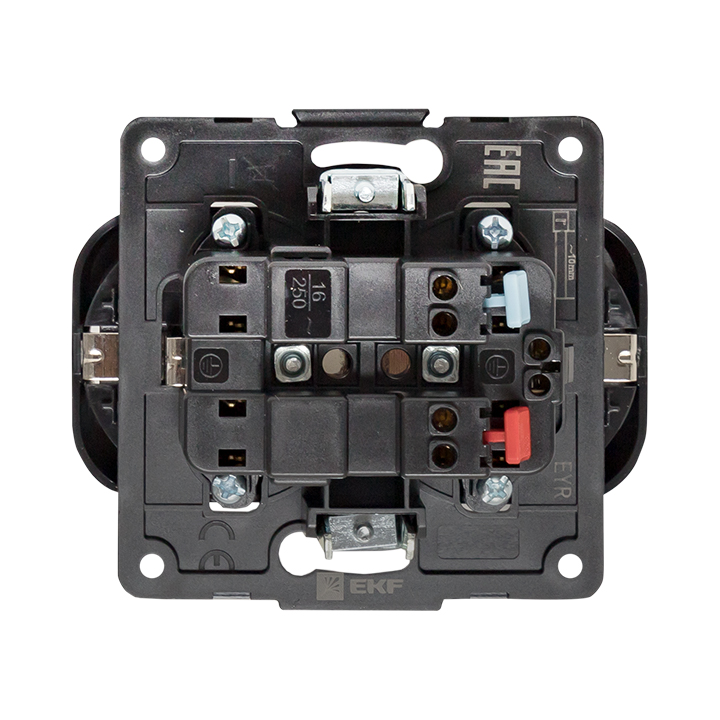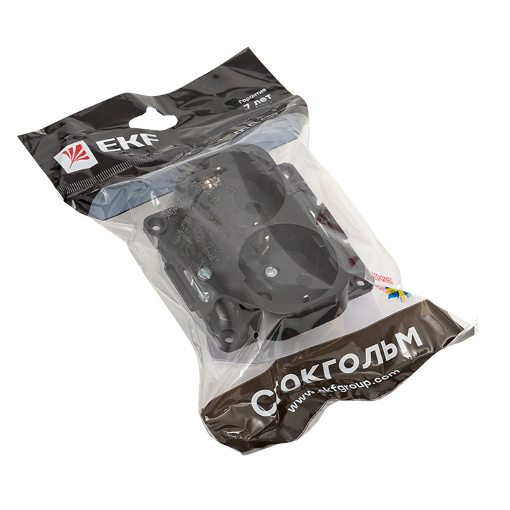 Название производителя: Стокгольм Механизм Розетки 2-местной с/з 16А автоматические клеммы черный с защ. штор. EKF