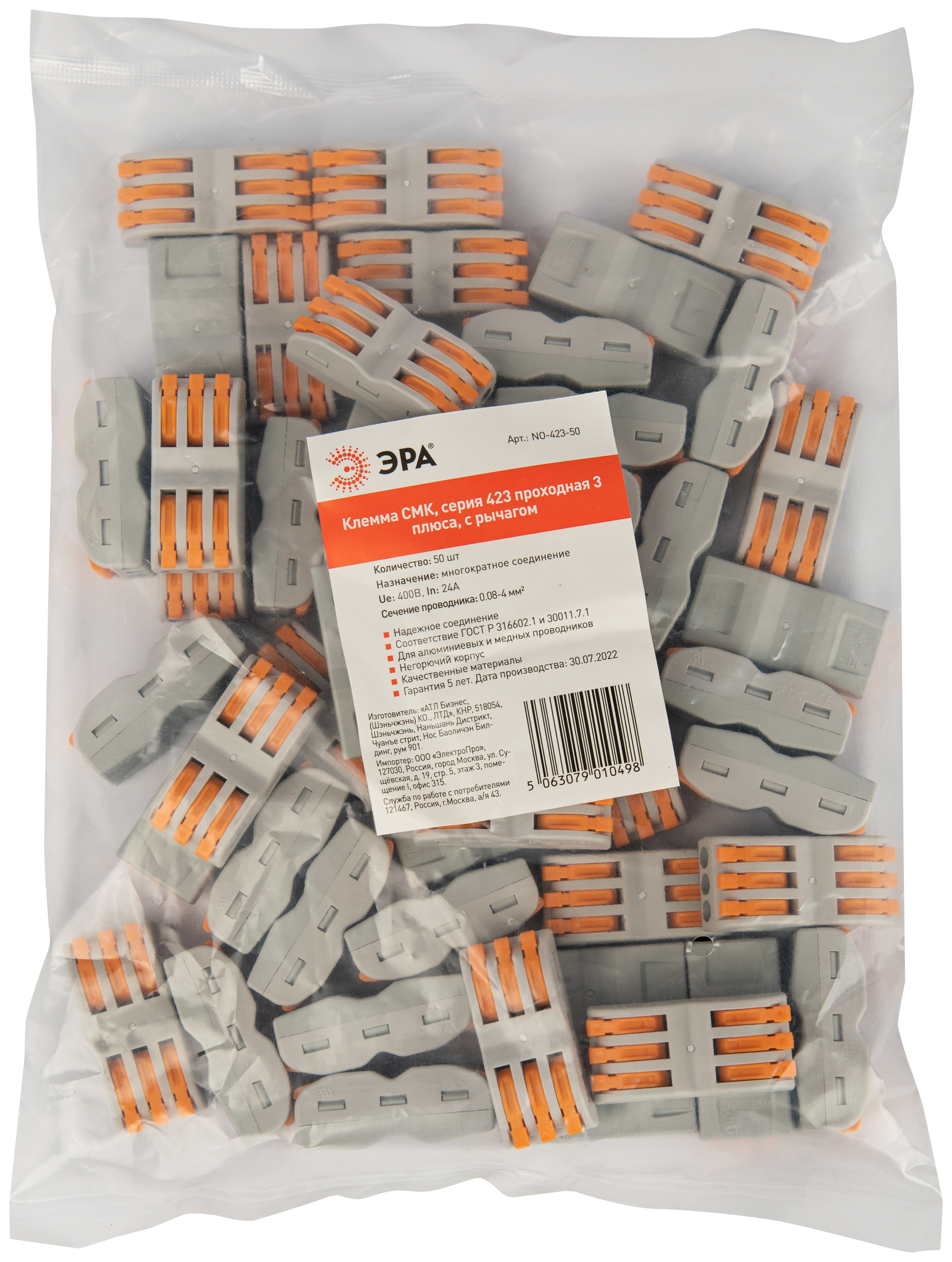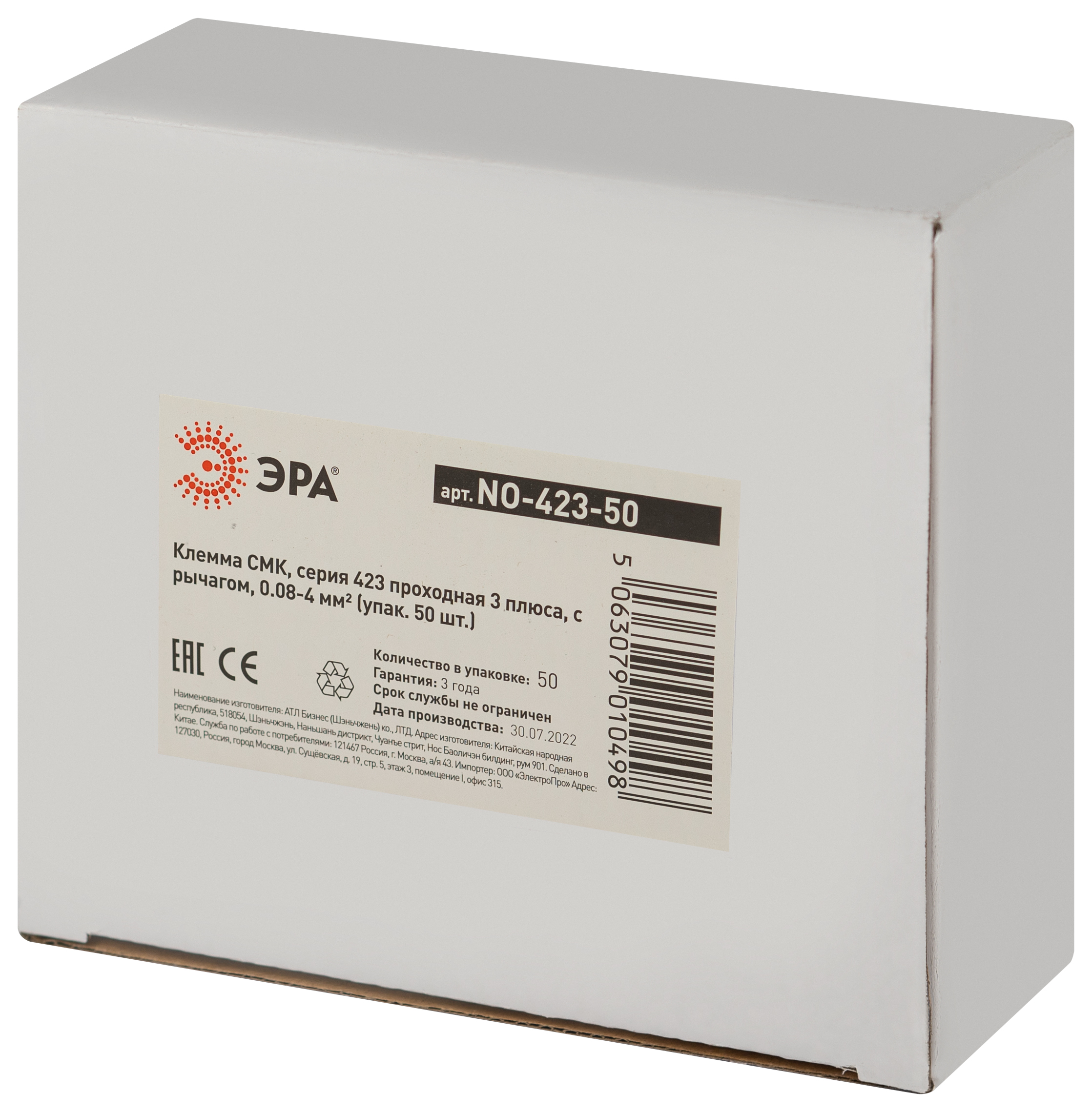 Название производителя: Клемма ЭРА серия 423 проходная 3 плюса с рычагом 0.08-4мм2 упаковка 50 шт