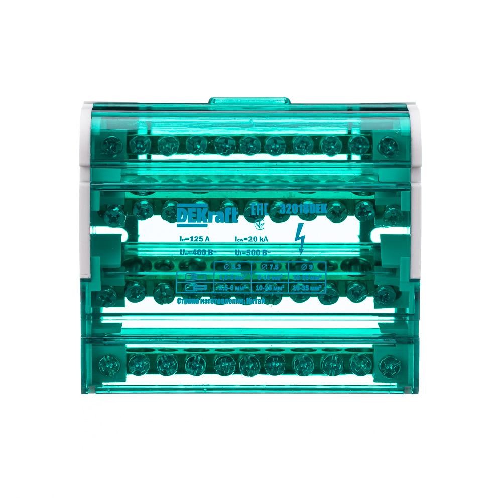 Кросс-модуль серии ШН-103 Dekraft; номинальный ток - 125 А; исполнение – 4 ряда по 11 отверстий (7х5,3 + 2x7,5 + 2x9,0); материал корпуса – нагревостойкий пластик; материал шин – высококачественная электротехническая бронза; каждая шина отдельно изолирована; цвет крышки – зеленый; установка – на DIN-рейку 35 мм или на монтажную панель двумя винтами M4; степень защиты - IP20. Применение кросс-модулей в щите обеспечивает компактную разводку кабелей и защиту от прикосновения к токоведущим частям.