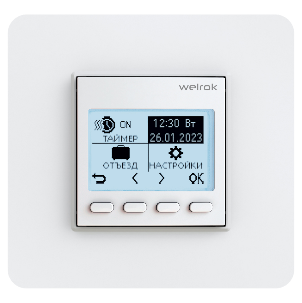 Широкое применение Welrok pro - терморегулятор с возможностью программирования недельного графика обогрева. Вы можете установить до 16 интервалов для каждого дня недели. В праздничные дни при желании можно установить индивидуальное расписание. Список праздничных дней можно выбрать из готового шаблона или создать индивидуальный.Максимальная экономия за счет:— гибкой настройки графика нагрева с использованием до 16 температурных периодов каждый день;— временного отключения нагрева при резком падении температуры в помещении, например, при проветривании;— поддержания экономной температуры во время отъезда;— возможности скорректировать расписание на основании данных статистики энергопотребления в регуляторе.Достижение максимального комфорта благодаря включению нагрева заранее в зависимости от особенностей помещения.Простая настройка работы терморегулятора благодаря мастеру настройки.Комплект1. терморегулятор Welrok pro2. декоративная рамка3. технический паспорт, инструкция по установке и эксплуатации, гарантийный талон4. упаковочная коробка