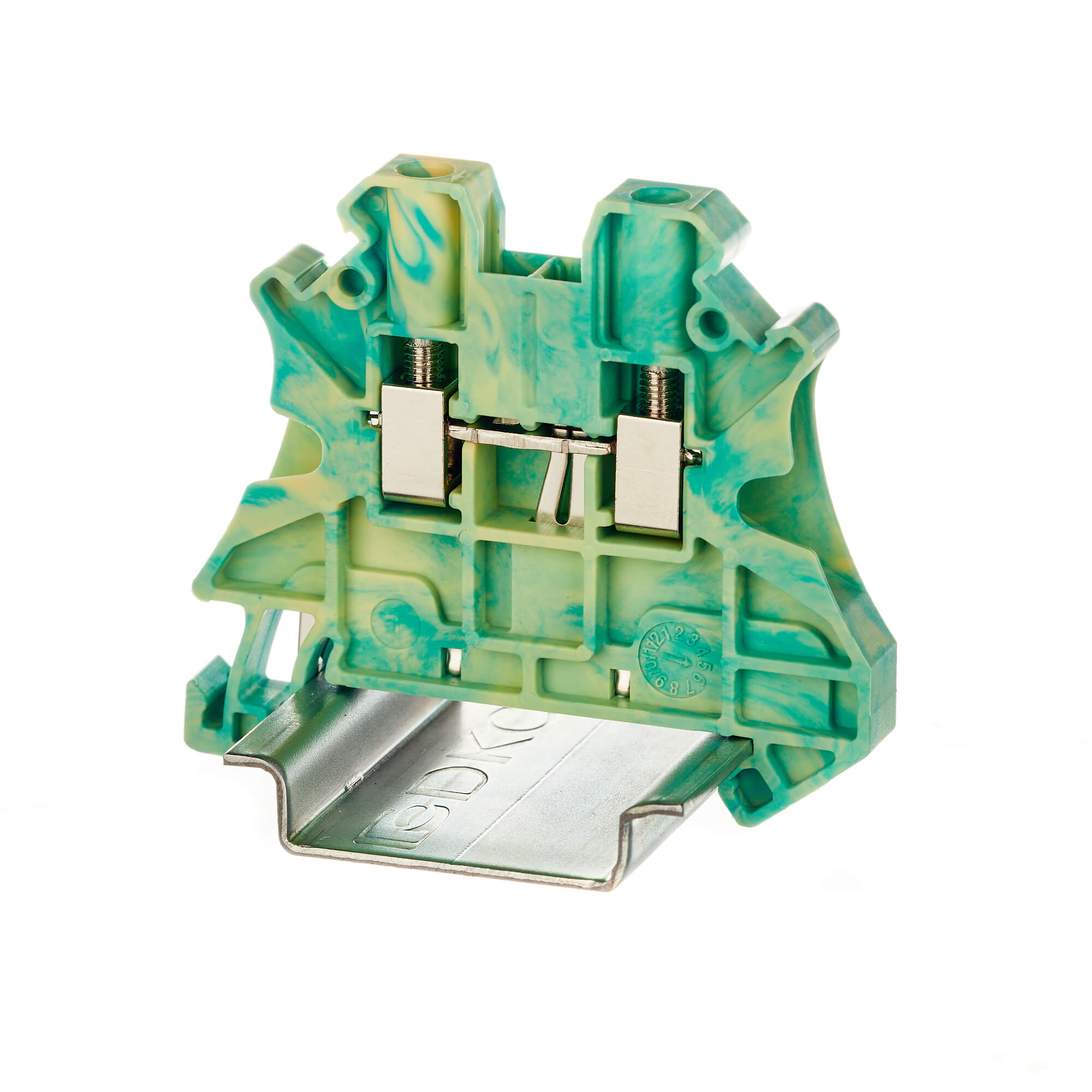 Клемма для заземления с винтовым зажимом предназначена для соединения двух проводников. Монтаж на DIN-рейку OMEGA. Температура эксплуатации от -40 до +105°C. Корпус выполнен из ПА 6.6 с классом горючести V0 UL-94. Имеет электрический контакт с DIN-рейкой.