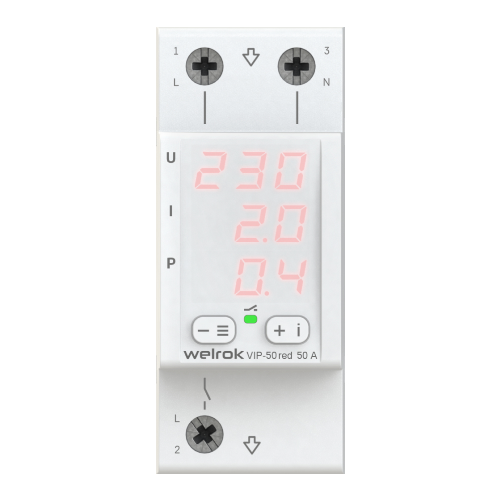 Многофункциональное реле Welrok VIP red защищает оборудование от скачков и провалов напряжения, последствий обрыва нулевого провода и превышения тока или полной мощности. Реле отключает нагрузку, если напряжение, ток или мощность выходит за установленные пределы и автоматически включает нагрузку, когда значение параметра вернется в норму. Гарантия 10 лет На все реле Welrok действует 10-летняя гарантия от производителя. 3 дополнительных преимущества, которые дает контроль по току в реле: 1. Возможность точного ограничения мощности нагрузки; 2. Возможность равномерно распределить нагрузку по фазам; 3. Визуальный контроль за текущим состоянием нагрузки. Максимальная функциональность Welrok VIP red — компактное реле на 2 модуля с мощным функционалом: Позволяет выбрать, по какому из параметров — ток или мощность — будет срабатывать защита вместе с защитой по напряжению. Скорость срабатывания реле < 0,03 сек. TrueRMS для точного измерения напряжения Для уменьшения количества срабатываний: - Защита от частых срабатываний - Регулируемый гистерезис - Регулируемая задержка включения нагрузки - Профессиональная модель отключения при выходе напряжения за пределы Для анализа питающей сети по характеру аварийных срабатываний: - Журнал срабатываний на 100 значений Для комфортной и безопасной эксплуатации: - Поправка напряжения и тока на экране - Регулировка яркости экрана - Защита от перегрева - Корпус реле напряжения изготовлен из пластика, не поддерживающего горение. Простая установка и удобное управление Реле отображает три параметра сети одновременно благодаря наличию трех экранов. Реле подключается без транзита нуля. Настройка реле осуществляется с помощью двух кнопок: « ➖ » « ☰ » (меню) и « ➕ » « ℹ️ ».