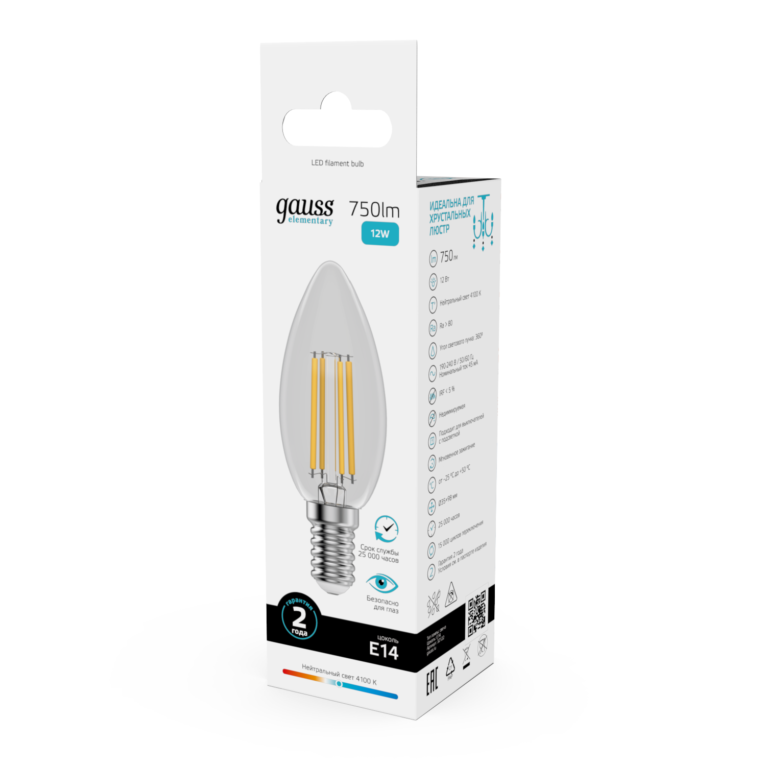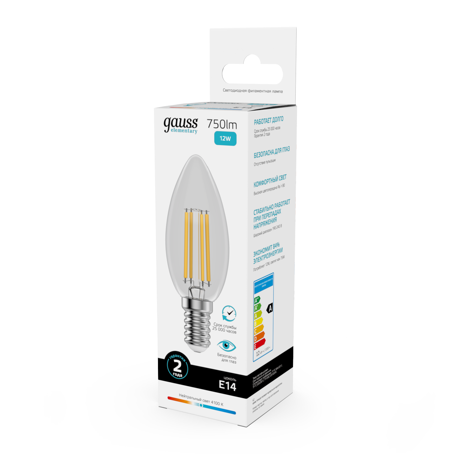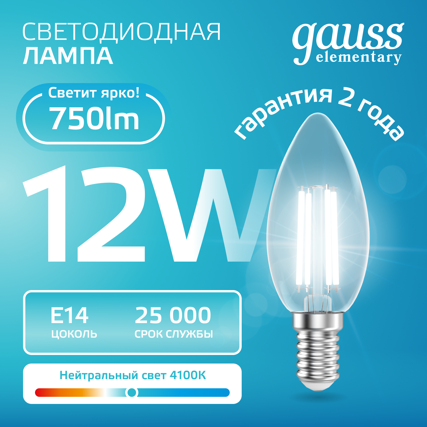 Название производителя: Лампа Gauss Filament Elementary Свеча 12W 750lm 4100К Е14 LED 1/10/100