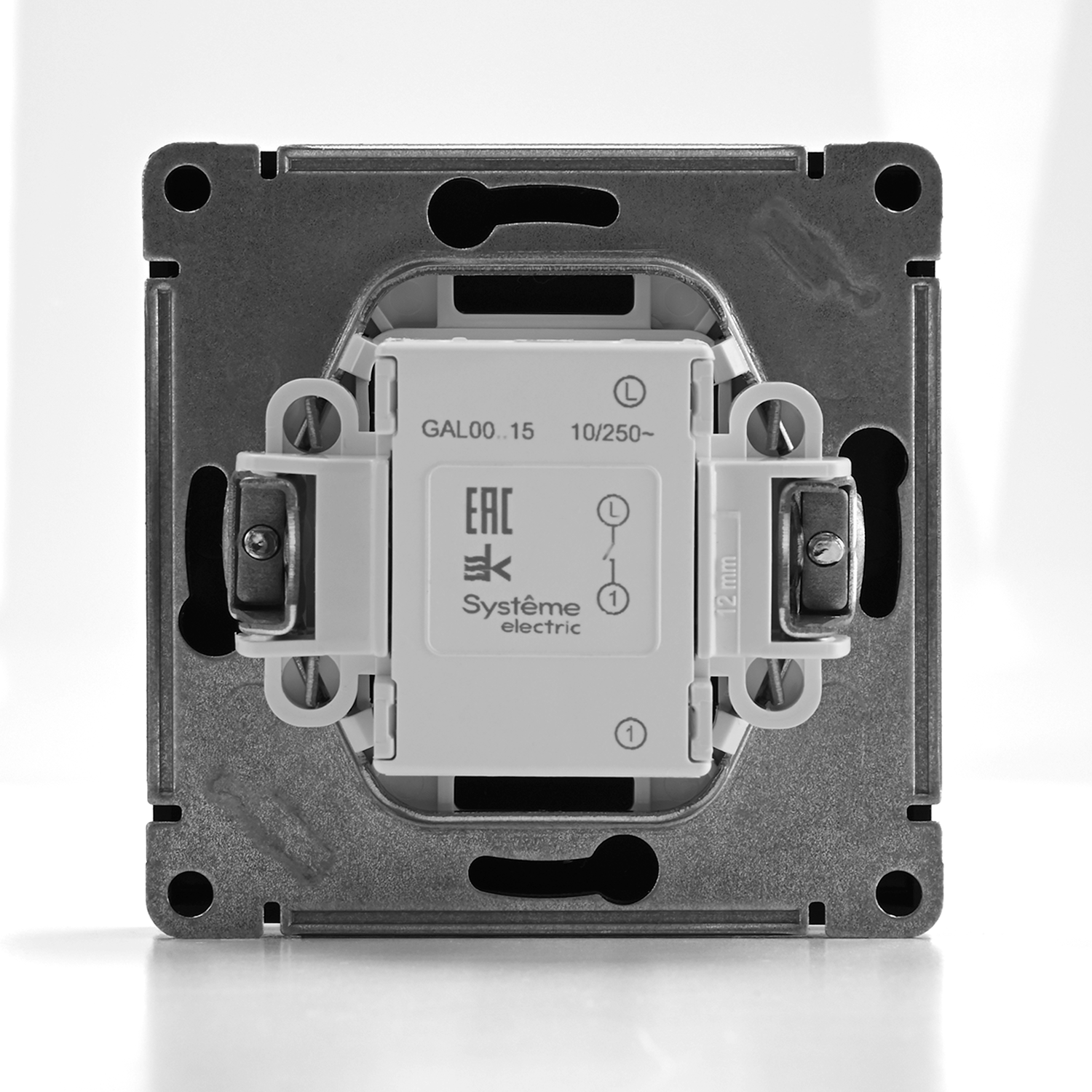 Механизм Systeme Electric серии ArtGallery в цвете карбон выключателя 1-клавишного с самовозвратом подходит для сетей 250 В, на ток 10 А.