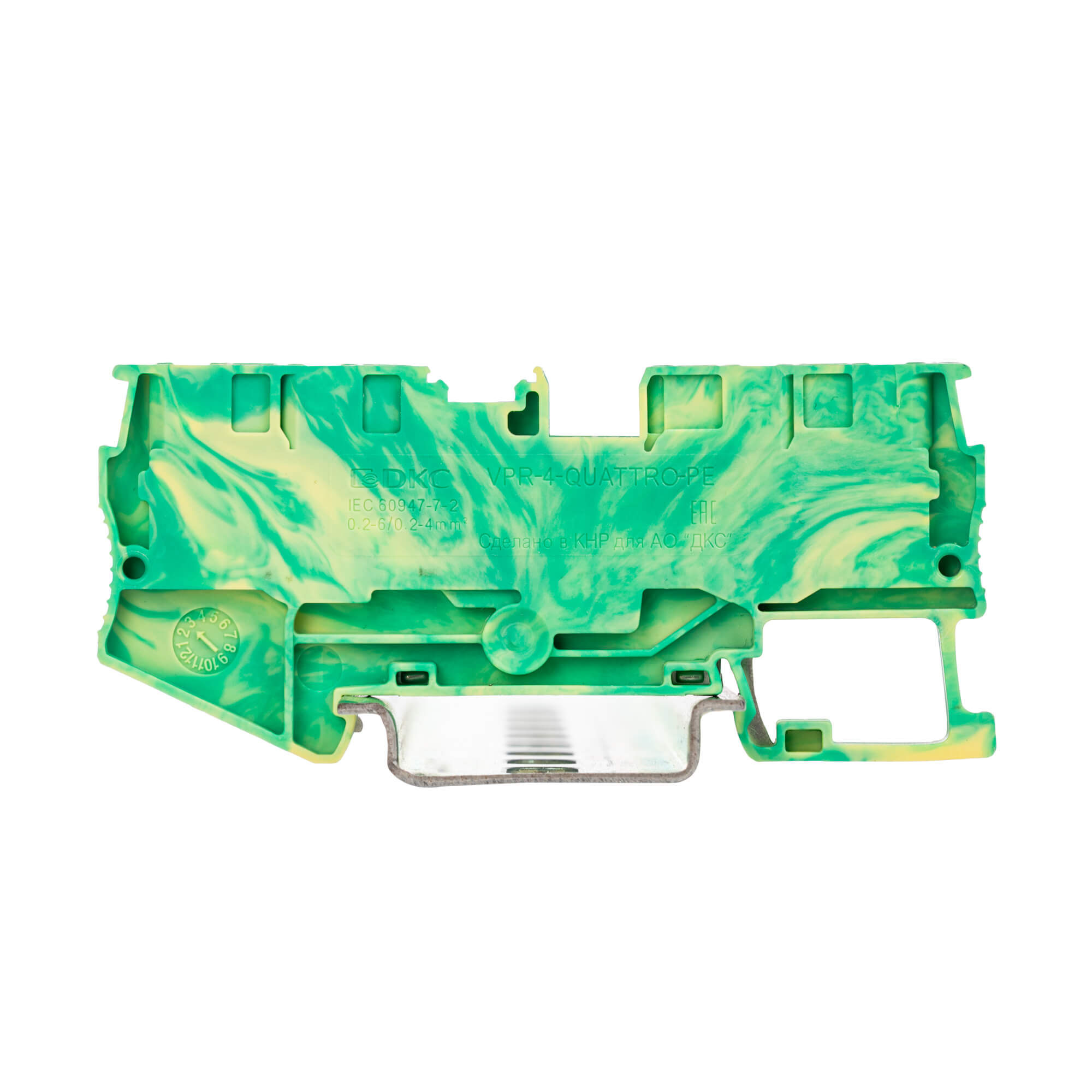Желто-зеленый цвет, 4 точки подключения, 4 мм². 2 канала вставных перемычек. Габариты (В×Ш×Г) 36,9×79×6,2 мм.