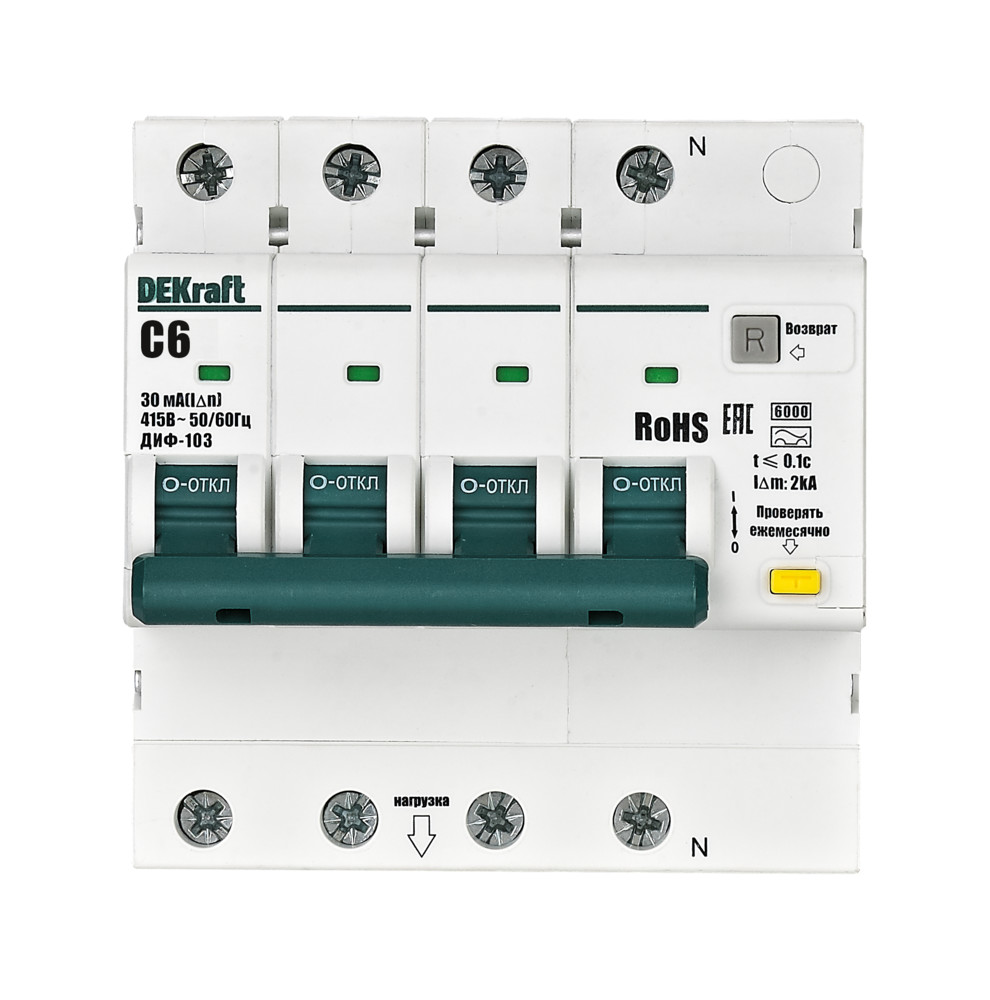 Автоматические выключатели дифференциального тока серии ДИФ-103 6кА NEW Dekraft; 3P+N; номинальный ток 6 А; ном. диф. ток 30 мА; тип диф. расцепителя - AC; кривая отключения - С; Icn, Ics = 6 кА; тип устройства - электронный; монтаж – на DIN-рейку. АВДТ обеспечивают три вида защиты - от короткого замыкания, перегрузки и возникновения утечки тока (в частности, вследствие прикосновения человека к токоведущим частям).