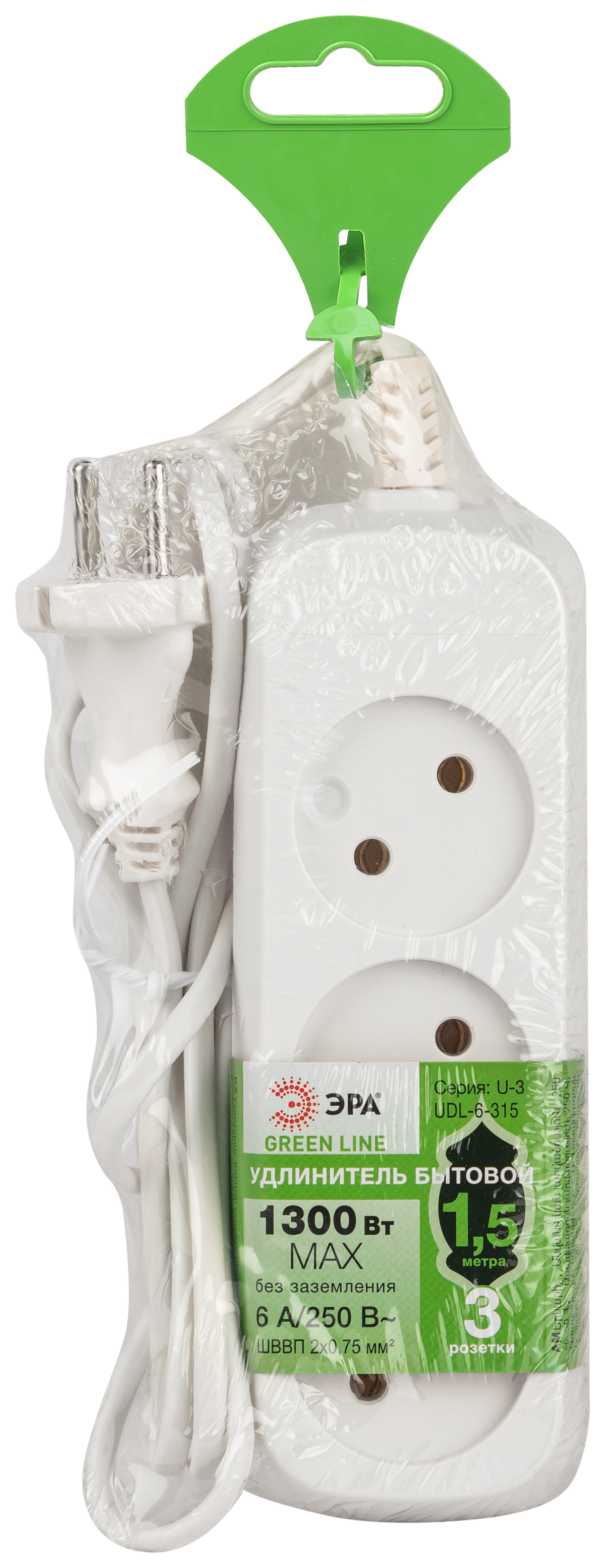 Название производителя: Удлинитель электрический ЭРА UDL-6-315 Greenline 3 розетки без заземления 1,5м ШВВП 2x0.75мм2