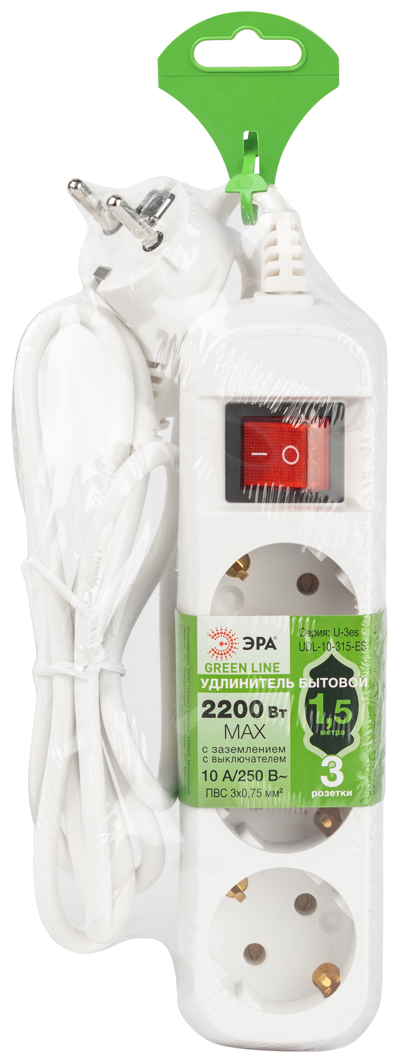 Удлинитель электрический Эра GREENLINE UDL-10-315-ES с заземлением, с выключателем, 3 розетки, провод 1,5м ПВС 3x0,75мм2. Рассчитан на максимальную мощность 10А/2200 Вт. Удлинитель станет Вашим надежным помощником, если любимые электроприборы находятся далеко от розеток. Корпус выполнен из ударопрочного и негорючего пластика (полипропилен). Вилка обеспечена кольцом для удобного извлечения ее из розетки. Модель удлинителя на 10А позволяет подключить бытовые приборы общей нагрузкой до 2200Вт.