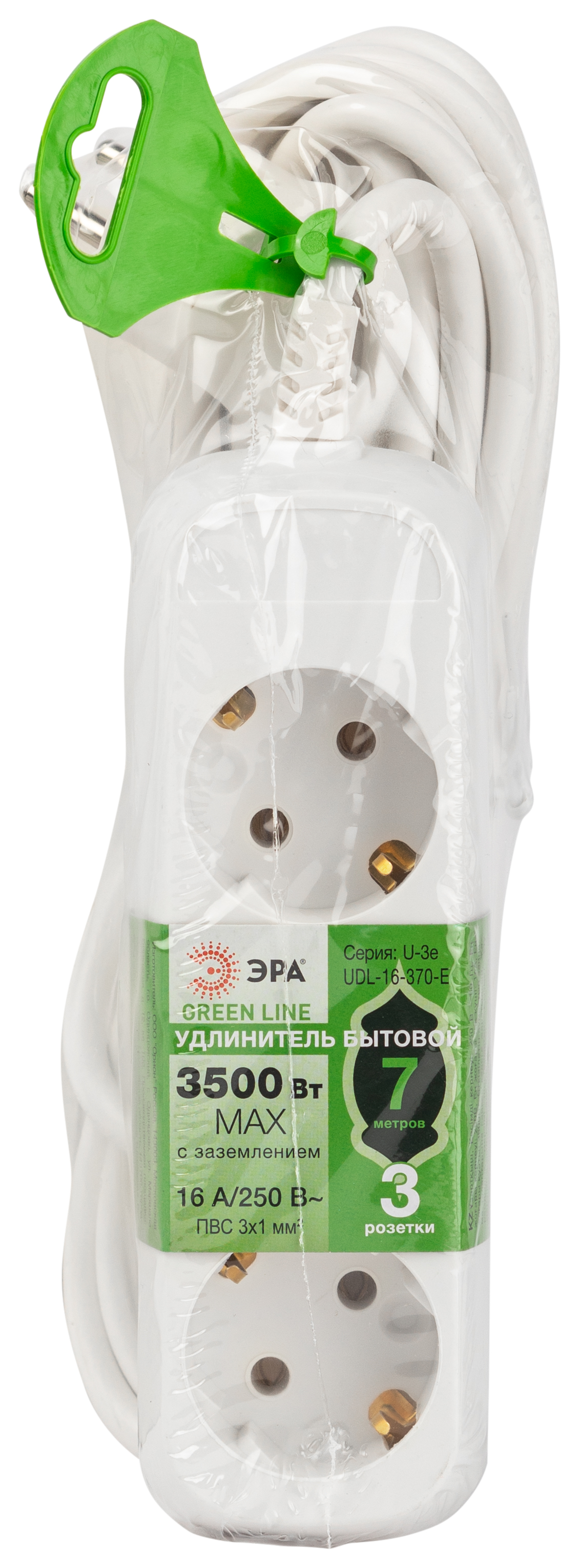Удлинитель электрический Эра GREENLINE UDL-16-370-E с заземлением, на 3 розетки, провод 7м ПВС 3x1мм2. Рассчитан на максимальную мощность 16А/3500 Вт. Удлинитель станет Вашим надежным помощником, если любимые электроприборы находятся далеко от розеток. Корпус выполнен из ударопрочного и негорючего пластика (полипропилен). Вилка обеспечена кольцом для удобного извлечения ее из розетки. Модель удлинителя на 16А позволяет подключить бытовые приборы общей нагрузкой до 3500Вт.