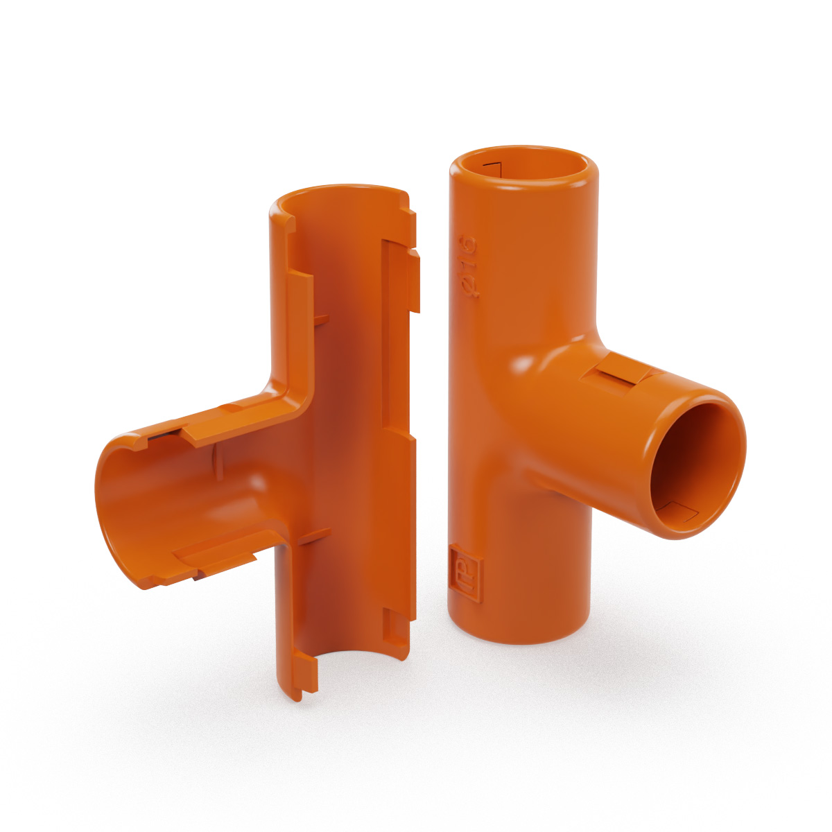 Предназначен для соединения гофрированных труб или гладких труб из пластика, образуя Т-образное ответвление, что позволяет придать более эстетичный внешний вид местам соединения. Состоит из двух частей соединяющихся друг с другом. Благодаря разъёмному корпусу, имеет возможность установки на уже смонтированную трассу. Ассортимент дополняют изделия оранжевого цвета в малой упаковке для использования в комплекте с гладкими и гофрированными трубами в таком же цвете.